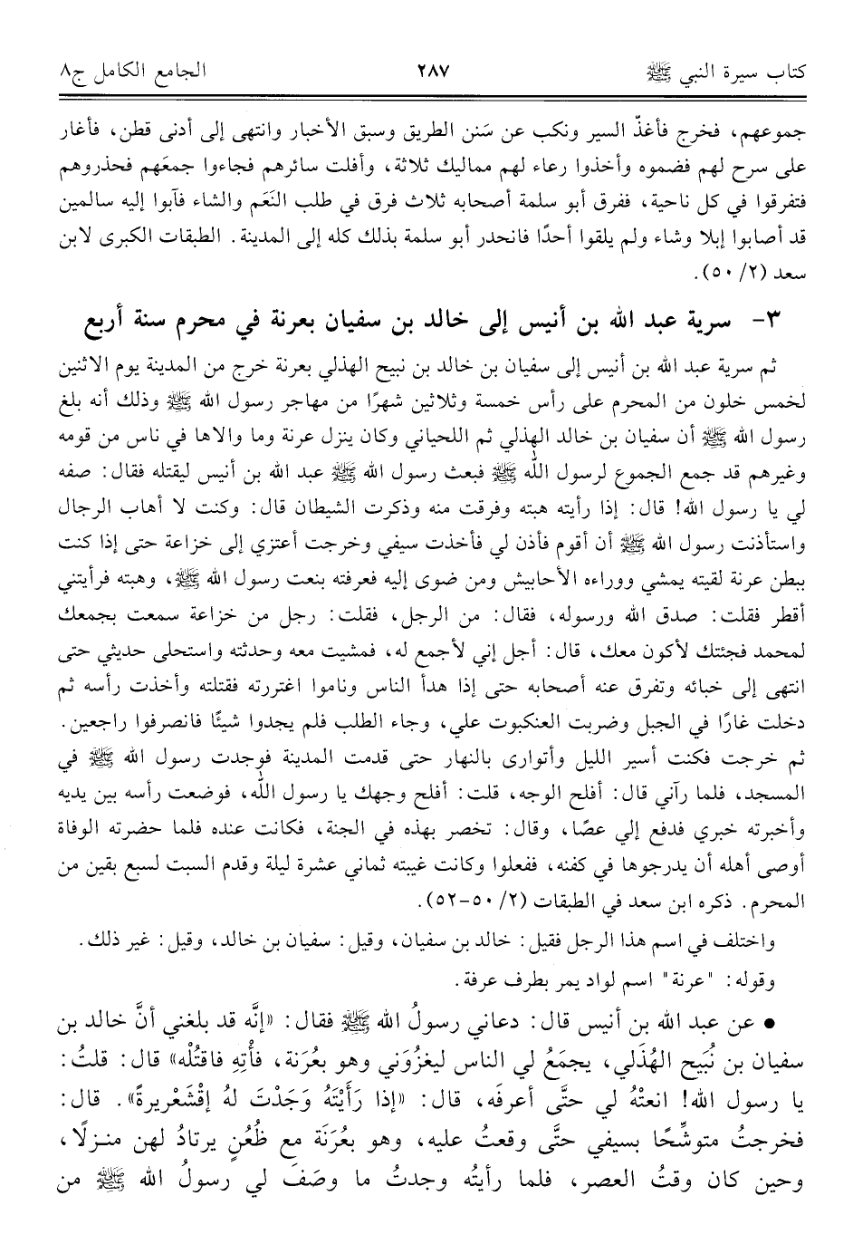 ثم سرية عبد الله بن أنيس إلى سفيان بن خالد بن نبيح الهذلي بعرنة خرج من المدينة يوم الاثنين لخمس خلون من المحرم على رأس خمسة وثلاثين شهرًا من مهاجر رسول الله - صلى الله عليه وسلم - وذلك أنه بلغ رسول الله - صلى الله عليه وسلم - أن سفيان بن خالد الهذلي ثم اللحياني وكان ينزل عرنة وما والاها في ناس من قومه وغيرهم قد جمع الجموع لرسول الله - صلى الله عليه وسلم - فبعث رسول الله - صلى الله عليه وسلم - عبد الله بن أنيس ليقتله فقال: صفه لي يا رسول الله! قال: إذا رأيته هبته وفرقت منه وذكرت الشيطان قال: وكنت لا أهاب الرجال واستأذنت رسول الله - صلى الله عليه وسلم - أن أقوم فأذن لي فأخذت سيفي وخرجت أعتزي إلى خزاعة حتى إذا كنت ببطن عرنة لقيته يمشي ووراءه الأحابيش ومن ضوى إليه فعرفته بنعت رسول الله - صلى الله عليه وسلم -، وهبته فرأيتني أقطر فقلت: صدق الله ورسوله، فقال: من الرجل، فقلت: رجل من خزاعة سمعت بجمعك لمحمد فجئتك لأكون معك، قال: أجل إني لأجمع له، فمشيت معه وحدثته واستحلى حديثي حتى انتهى إلى خبائه وتفرق عنه أصحابه حتى إذا هدأ الناس وناموا اغتررته فقتلته وأخذت رأسه ثم دخلت غارًا في الجبل وضربت العنكبوت علي، وجاء الطلب فلم يجدوا شيئًا فانصرفوا راجعين. ثم خرجت فكنت أسير الليل وأتوارى بالنهار حتى قدمت المدينة فوجدت رسول الله - صلى الله عليه وسلم - في المسجد، فلما رآني قال: أفلح الوجه، قلت: أفلح وجهك يا رسول الله، فوضعت رأسه بين يديه وأخبرته خبري فدفع إلي عصًا، وقال: تخصر بهذه في الجنة، فكانت عنده فلما حضرته الوفاة أوصى أهله أن يدرجوها في كفنه، ففعلوا وكانت غيبته ثماني عشرة ليلة وقدم السبت لسبع بقين من المحرم. ذكره ابن سعد في الطبقات (٢/ ٥٠ - ٥٢).