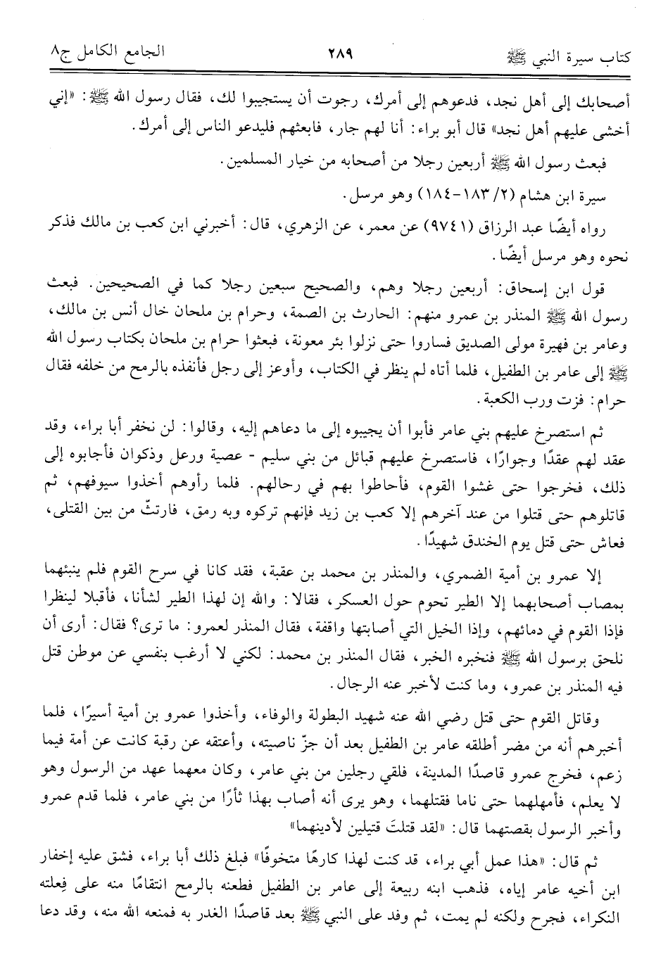 قول ابن إسحاق: أربعين رجلا وهم، والصحيح سبعين رجلا كما في الصحيحين. فبعث رسول الله - صلى الله عليه وسلم - المنذر بن عمرو منهم: الحارث بن الصمة، وحرام بن ملحان خال أنس بن مالك، وعامر بن فهيرة مولى الصديق فساروا حتى نزلوا بئر معونة، فبعثوا حرام بن ملحان بكتاب رسول الله - صلى الله عليه وسلم - إلى عامر بن الطفيل، فلما أتاه لم ينظر في الكتاب، وأوعز إلى رجل فأنفذه بالرمح من خلفه فقال حرام: فزت ورب الكعبة.