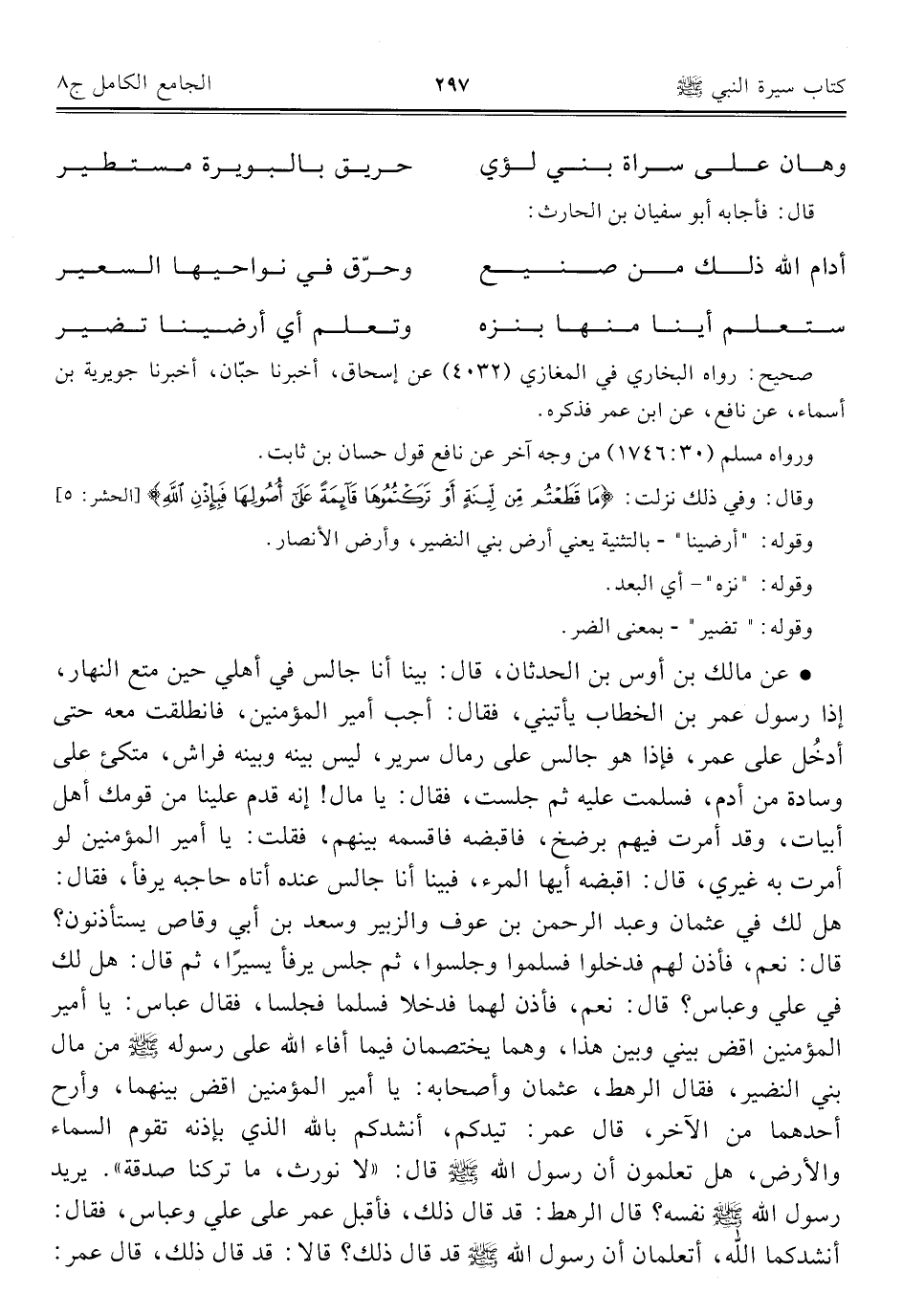 • عن مالك بن أوس بن الحدثان، قال: بينا أنا جالس في أهلي حين متع النهار، إذا رسول عمر بن الخطاب يأتيني، فقال: أجب أمير المؤمنين، فانطلقت معه حتى أدخُل على عمر، فإذا هو جالس على رمال سرير، ليس بينه وبينه فراش، متكئ على وسادة من أدم، فسلمت عليه ثم جلست، فقال: يا مال! إنه قدم علينا من قومك أهل أبيات، وقد أمرت فيهم برضخ، فاقبضه فاقسمه بينهم، فقلت: يا أمير المؤمنين لو أمرت به غيري، قال: اقبضه أيها المرء، فبينا أنا جالس عنده أتاه حاجبه يرفأ، فقال: هل لك في عثمان وعبد الرحمن بن عوف والزبير وسعد بن أبي وقاص يستأذنون؟ قال: نعم، فأذن لهم فدخلوا فسلموا وجلسوا، ثم جلس يرفأ يسيرًا، ثم قال: هل لك في علي وعباس؟ قال: نعم، فأذن لهما فدخلا فسلما فجلسا، فقال عباس: يا أمير المؤمنين اقض بيني وبين هذا، وهما يختصمان فيما أفاء الله على رسول - صلى الله عليه وسلم - من مال بني النضير، فقال الرهط، عثمان وأصحابه: يا أمير المؤمنين اقض بينهما، وأرح أحدهما من الآخر، قال عمر: تيدكم، أنشدكم بالله الذي بإذنه تقوم السماء والأرض، هل تعلمون أن رسول الله - صلى الله عليه وسلم - قال: "لا نورث، ما تركنا صدقة". يريد رسول الله - صلى الله عليه وسلم - نفسه؟ قال الرهط: قد قال ذلك، فأقبل عمر على علي وعباس، فقال: أنشدكما الله، أتعلمان أن رسول الله - صلى الله عليه وسلم - قد قال ذلك؟ قالا: قد قال ذلك، قال عمر: