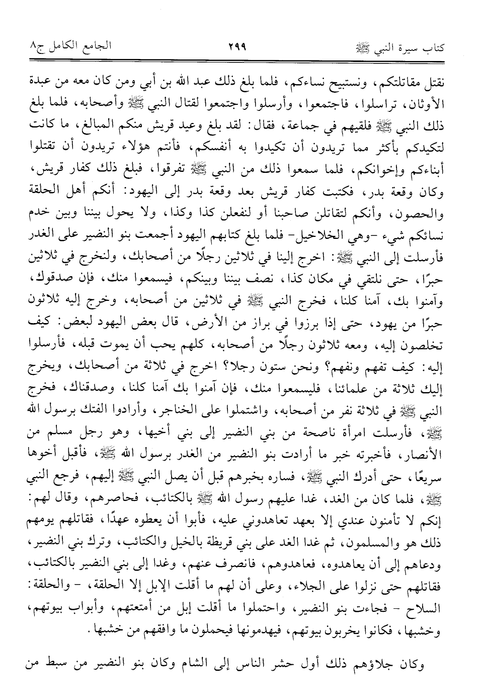 نقتل مقاتلتكم، ونستبيح نساءكم، فلما بلغ ذلك عبد الله بن أبي ومن كان معه من عبدة الأوثان، تراسلوا، فاجتمعوا، وأرسلوا واجتمعوا لقتال النبي - صلى الله عليه وسلم - وأصحابه، فلما بلغ ذلك النبي - صلى الله عليه وسلم - فلقيهم في جماعة، فقال: لقد بلغ وعيد قريش منكم المبالغ، ما كانت لتكيدكم بأكثر مما تريدون أن تكيدوا به أنفسكم، فأنتم هؤلاء تريدون أن تقتلوا أبناءكم وإخوانكم، فلما سمعوا ذلك من النبي - صلى الله عليه وسلم - تفرقوا، فبلغ ذلك كفار قريش، وكان وقعة بدر، فكتبت كفار قريش بعد وقعة بدر إلى اليهود: أنكم أهل الحلقة والحصون، وأنكم لتقاتلن صاحبنا أو لنفعلن كذا وكذا، ولا يحول بيننا وبين خدم نسائكم شيء - وهي الخلاخيل - فلما بلغ كتابهم اليهود أجمعت بنو النضير على الغدر فأرسلت إلى النبي - صلى الله عليه وسلم -: اخرج إلينا في ثلاثين رجلًا من أصحابك، ولنخرج في ثلاثين حبرًا، حتى نلتقي في مكان كذا، نصف بيننا وبينكم، فيسمعوا منك، فإن صدقوك، وآمنوا بك، آمنا كلنا، فخرج النبي - صلى الله عليه وسلم - في ثلاثين من أصحابه، وخرج إليه ثلاثون حبرًا من يهود، حتى إذا برزوا في براز من الأرض، قال بعض اليهود لبعض: كيف تخلصون إليه، ومعه ثلاثون رجلًا من أصحابه، كلهم يحب أن يموت قبله، فأرسلوا إليه: كيف تفهم ونفهم؟ ونحن ستون رجلا؟ اخرج في ثلاثة من أصحابك، ويخرج إليك ثلاثة من علمائنا، فليسمعوا منك، فإن آمنوا بك آمنا كلنا، وصدقناك، فخرج النبي - صلى الله عليه وسلم - في ثلاثة نفر من أصحابه، واشتملوا على الخناجر، وأرادوا الفتك برسول الله - صلى الله عليه وسلم -، فأرسلت امرأة ناصحة من بني النضير إلى بني أخيها، وهو رجل مسلم من الأنصار، فأخبرته خبر ما أرادت بنو النضير من الغدر برسول الله - صلى الله عليه وسلم -، فأقبل أخوها سريعًا، حتى أدرك النبي - صلى الله عليه وسلم -، فساره بخبرهم قبل أن يصل النبي - صلى الله عليه وسلم - إليهم، فرجع النبي - صلى الله عليه وسلم -، فلما كان من الغد، غدا عليهم رسول الله - صلى الله عليه وسلم - بالكتائب، فحاصرهم، وقال لهم: إنكم لا تأمنون عندي إلا بعهد تعاهدوني عليه، فأبوا أن يعطوه عهدًا، فقاتلهم يومهم ذلك هو والمسلمون، ثم غدا الغد علي بني قريظة بالخيل والكتائب، وترك بني النضير، ودعاهم إلى أن يعاهدوه، فعاهدوهم، فانصرف عنهم، وغدا إلى بني النضير بالكتائب، فقاتلهم حتى نزلوا على الجلاء، وعلى أن لهم ما أقلت الإبل إلا الحلقة، - والحلقة: السلاح - فجاءت بنو النضير، واحتملوا ما أقلت إبل من أمتعتهم، وأبواب بيوتهم، وخشبها، فكانوا يخربون بيوتهم، فيهدمونها فيحملون ما وافقهم من خشبها.