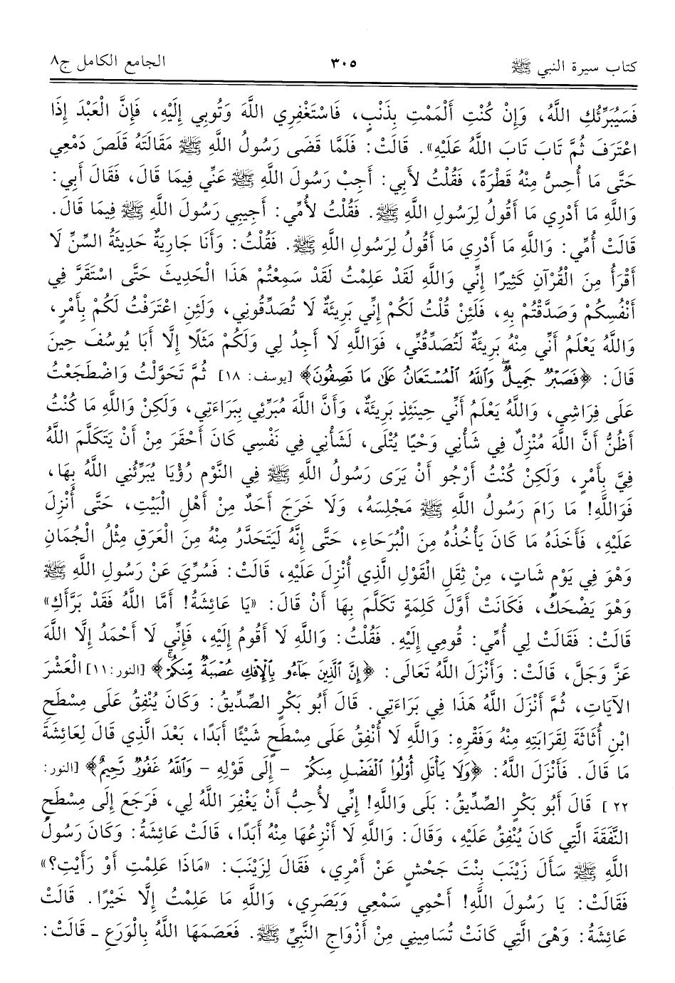 فَسَيُبَرِّئُكِ اللهُ، وَإنْ كُنْتِ أَلْمَمْتِ بِذَنْبٍ، فَاسْتَغْفِرِي اللهَ وَتُوبِي إِلَيْهِ، فَإِنَّ الْعَبْدَ إِذَا اعْتَرَفَ ثُمَّ تَابَ تَابَ اللهُ عَلَيْهِ". قَالَتْ: فَلَمَّا قَضَى رَسُولُ اللهِ - صلى الله عليه وسلم - مَقَالَتَهُ قَلَصَ دَمْعِي حَتَّى مَا أُحِسُّ مِنْهُ قَطْرَةً، فَقُلْتُ لأَبِي: أَجِبْ رَسُولَ اللهِ - صلى الله عليه وسلم - عَنِّي فِيمَا قَالَ، فَقَالَ أَبِي: وَاللهِ مَا أَدْرِي مَا أَقُولُ لِرَسُولِ اللهِ - صلى الله عليه وسلم -. فَقُلْتُ لأُمِّي: أَجِيبِي رَسُولَ اللهِ - صلى الله عليه وسلم - فِيمَا قَالَ. قَالَتْ أُمِّي: وَاللهِ مَا أَدْرِي مَا أَقُولُ لِرَسُولِ اللهِ - صلى الله عليه وسلم -. فَمُلْتُ: وَأَنَا جَارِيَةٌ حَدِيثَةُ السِّنِّ لَا أَقْرَأُ مِنَ الْقُرْآنِ كَثِيرًا إِنِّي وَاللهِ لَقَدْ عَلِمْتُ لَقَدْ سَمِعْتُمْ هَذَا الْحَدِيثَ حَتَّى اسْتَقَرَّ فِي أَنْفُسِكُمْ وَصَدَّقْتُمْ بِهِ، فَلَئِنْ قُلْتُ لَكُمْ إِنِّي بَرِيئَةٌ لَا تُصَدِّقُونِي، وَلَئِنِ اعْتَرَفْتُ لَكُم بِأَمْرٍ، وَاللَّهُ يَعْلَمُ أَنِّي مِنْه برِيئَةٌ لَتُصَدِّقُنِّي، فَوَاللهِ لَا أَجِدُ لِي وَلَكُمْ مَثَلًا إِلَّا أَبَا يُوسُف حِينَ قَالَ: {فَصَبْرٌ جَمِيلٌ وَاللَّهُ الْمُسْتَعَانُ عَلَى مَا تَصِفُونَ} [يوسف: ١٨] ثُمَّ تَحَوَّلْتُ وَاضْطَجَعْتُ عَلَى فِرَاشِي، وَاللَّهُ يَعْلَمُ أَنِّي حِينَئِذٍ بَرِيئَةٌ، وَأَنَّ اللَّهَ مُبَرِّئِي بِبَرَاءَتِي، وَلَكِنْ وَاللهِ مَا كُنْتُ أَظُنُّ أَنَّ اللَّهَ مُنْزِلٌ فِي شَأنِي وَحْيًا يُتْلَى، لَشَأْنِي فِي نَفْسِي كَانَ أَحْقَرَ مِنْ أَنْ يَتَكَلَّمَ اللهُ فِيَّ بأَمْرٍ، وَلَكِنْ كُنْتُ أَرْجُو أَنْ يَرَى رَسُولُ اللهِ - صلى الله عليه وسلم - فِي النَّوْم رُويَا يُبَرِّئُنِي اللهُ بِهَا، فَوَاللهِ! مَا رَامَ رَسُولُ اللهِ - صلى الله عليه وسلم - مَجْلِسَهُ، وَلَا خَرَجَ أَحَدٌ مِنْ أَهْلِ الْبَيْتِ، حَتَّى أُنْزِلَ عَلَيْهِ، فَأَخَذَهُ مَا كَانَ يَأْخُذُهُ مِنَ الْبُرَحَاءِ، حَتَّى إِنَّهُ لَيَتَحَدَّرُ مِنْهُ مِنَ الْعَرَقِ مِثْلُ الْجُمَانِ وَهْوَ فِي يَوْم شَاتٍ، مِنْ ثِقَلِ الْقَوْلِ الَّذِي أُنْزِلَ عَلَيْهِ، قَالَتْ: فَسُرِّيَ عَنْ رَسُولِ اللهِ - صلى الله عليه وسلم - وَهْوَ يَضحَك، فَكَانَتْ أَوَّلَ كَلِمَةٍ تَكَلَّمَ بِهَا أَنْ قَالَ: "يَا عَائِشَةُ! أَمَّا اللهُ فَقَدْ بَرَّأَكِ" قَالَتْ: فَقَالَتْ لِي أُمِّي: قُومِي إِلَيْهِ. فَقُلْتُ: وَاللهِ لَا أَقُومُ إِلَيْهِ، فَإِنِّي لَا أَحْمَدُ إِلَّا اللهَ عَزَّ وَجَلَّ، قَالَتْ: وَأَنْزَلَ اللهُ تَعَالَى: {إِنَّ الَّذِينَ جَاءُوا بِالْإِفْكِ عُصْبَةٌ مِنْكُمْ} [النور: ١١] الْعَشْرَ الآيَاتِ، ثُمَّ أَنْزَلَ اللهُ هَذَا فِي بَرَاءَتِي. قَالَ أَبُو بَكْرٍ الصِّدِّيقُ: وَكَانَ يُنْفِقُ عَلَى مِسْطَحِ بْنِ أُثَاثَةَ لِقَرَابَتِهِ مِنْهُ وَفَقْرِهِ: وَاللهِ لَا أُنْفِقُ عَلَى مِسْطَحٍ شَيْئًا أَبَدًا، بَعْدَ الَّذِي قَالَ لِعَائِشَةَ مَا قَالَ. فَأَنْزَلَ اللهُ: {وَلَا يَأْتَلِ أُولُو الْفَضْلِ مِنْكُمْ - إِلَى قَوْلِهِ - وَاللَّهُ غَفُورٌ رَحِيمٌ} [النور: ٢٢] قَالَ أَبُو بَكْرٍ الصّدِّيقُ: بَلَى وَاللهِ! إِنِّي لأُحِبُّ أَنْ يَغْفِرَ اللهُ لِي، فَرَجَعَ إِلَى مِسْطَح النَّفَقَةَ الَّتِي كَانَ يُنْفِقُ عَلَيْهِ، وَقَالَ: وَاللهِ لَا أَنْزِعُهَا مِنْهُ أَبَدًا، قَالَتْ عَائِشَةُ: وَكَانَ رَسُولُ اللهِ - صلى الله عليه وسلم - سَأَلَ زَيْنَبَ بنْتَ جَحْشٍ عَنْ أَمْرِي، فَقَالَ لِزَيْنَبَ: "مَاذَا عَلِمْتِ أَوْ رَأَيْتِ؟ " فَقَالَتْ: يَا رَسُولَ اللهِ! أَحْمِي سَمْعِي وَبَصَرِي، وَاللهِ مَا عَلِمْتُ إِلَّا خَيْرًا. قَالَتْ عَائِشَةُ: وَهْيَ الَّتِي كَانَتْ تُسَامِينِي مِنْ أَزْوَاجِ النَّبِيِّ - صلى الله عليه وسلم