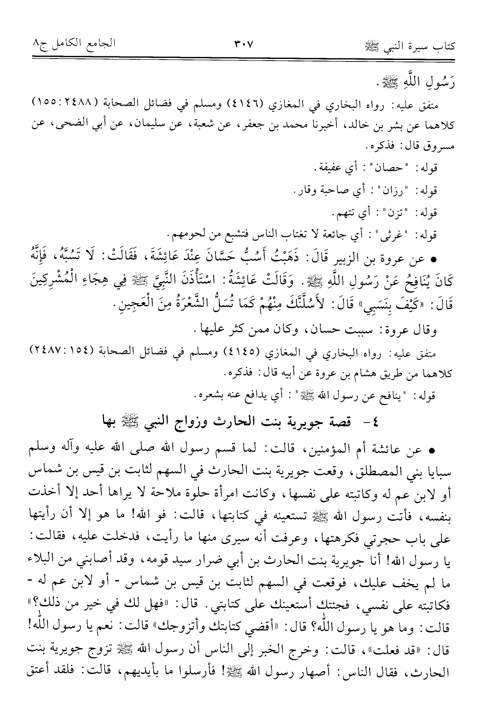 • عن عائشة أم المؤمنين، قالت: لما قسم رسول الله صلى الله عليه وآله وسلم سبايا بني المصطلق، وقعت جويرية بنت الحارث في السهم لثابت بن قيس بن شماس أو لابن عم له وكاتبته على نفسها، وكانت امرأة حلوة ملاحة لا يراها أحد إلا أخذت بنفسه، فأتت رسول الله - صلى الله عليه وسلم - تستعينه في كتابتها، قالت: فوالله! ما هو إلا أن رأيتها على باب حجرتي فكرهتها، وعرفت أنه سيرى منها ما رأيت، فدخلت عليه، فقالت: يا رسول الله! أنا جويرية بنت الحارث بن أبي ضرار سيد قومه، وقد أصابني من البلاء ما لم يخف عليك، فوقعت في السهم لثابت بن قيس بن شماس - أو لابن عم له - فكاتبته على نفسي، فجئتك أستعينك على كتابتي. قال: "فهل لك في خير من ذلك؟ " قالت: وما هو يا رسول الله؟ قال: "أقضي كتابتك وأتزوجك" قالت: نعم يا رسول الله! قال: "قد فعلت"، قالت: وخرج الخبر إلى الناس أن رسول الله - صلى الله عليه وسلم - تزوج جويرية بنت الحارث، فقال الناس: أصهار رسول الله - صلى الله عليه وسلم -! فأرسلوا ما بأيديهم، قالت: فلقد أعتق