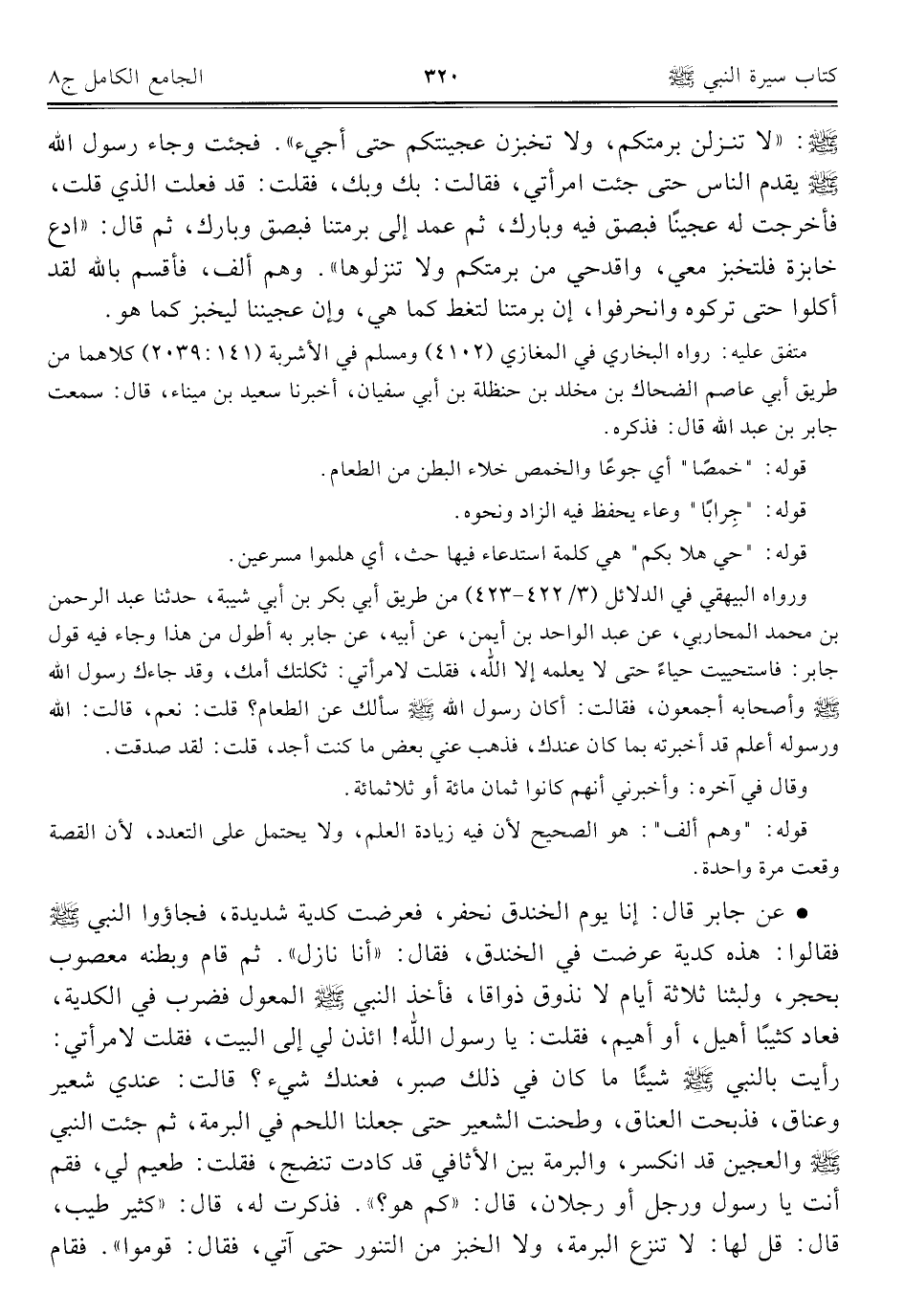 - صلى الله عليه وسلم -: "لا تنزلن برمتكم، ولا تخبزن عجينتكم حتَّى أجيء". فجئت وجاء رسول الله - صلى الله عليه وسلم - يقدم الناس حتَّى جئت امرأتي، فقالت: بك وبك، فقلت: قد فعلت الذي قلت، فأخرجت له عجينًا فبصق فيه وبارك، ثمّ عمد إلى برمتنا فبصق وبارك، ثمّ قال: "ادع خابزة فلتخبز معي، واقدحي من برمتكم ولا تنزلوها". وهم ألف، فأقسم بالله لقد أكلوا حتَّى تركوه وانحرفوا، إن برمتنا لتغط كما هي، وإن عجيننا ليخبز كما هو.