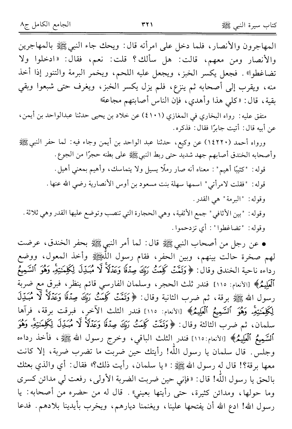• عن رجل من أصحاب النَّبِيّ - صلى الله عليه وسلم - قال: لما أمر النبي - صلى الله عليه وسلم - بحفر الخندق، عرضت لهم صخرة حالت بينهم، وبين الحفر، فقام رسول الله - صلى الله عليه وسلم - وأخذ المعول، ووضع رداءه ناحية الخندق وقال: {وَتَمَّتْ كَلِمَتُ رَبِّكَ صِدْقًا وَعَدْلًا لَا مُبَدِّلَ لِكَلِمَاتِهِ وَهُوَ السَّمِيعُ الْعَلِيمُ} [الأنعام: ١١٥] فندر ثلث الحجر، وسلمان الفارسي قائم ينظر، فبرق مع ضربة رسول الله - صلى الله عليه وسلم - برقة، ثمّ ضرب الثانية وقال: {وَتَمَّتْ كَلِمَتُ رَبِّكَ صِدْقًا وَعَدْلًا لَا مُبَدِّلَ لِكَلِمَاتِهِ وَهُوَ السَّمِيعُ الْعَلِيمُ} [الأنعام: ١١٥] فندر الثلث الآخر، فبرقت برقة، فرآها سلمان، ثمّ ضرب الثالثة وقال: {وَتَمَّتْ كَلِمَتُ رَبِّكَ صِدْقًا وَعَدْلًا لَا مُبَدِّلَ لِكَلِمَاتِهِ وَهُوَ السَّمِيعُ الْعَلِيمُ} [الأنعام: ١١٥]، فندر الثلث الباقي، وخرج رسول الله - صلى الله عليه وسلم -، فأخذ رداءه وجلس. قال سلمان يا رسول الله! رأيتك حين ضربت ما تضرب ضربة، إِلَّا كانت معها برقة؟ ! قال له رسول الله - صلى الله عليه وسلم -: "يا سلمان، رأيت ذلك؟ " فقال: أي والذي بعثك بالحق يا رسول الله! قال: "فإني حين ضربت الضربة الأولى، رفعت لي مدائن كسرى وما حولها، ومدائن كثيرة، حتَّى رأيتها بعيني". قال له من حضره من أصحابه: يا رسول الله! ادع الله أن يفتحها علينا، ويغنمنا ديارهم، ويخرب بأيدينا بلادهم. فدعا