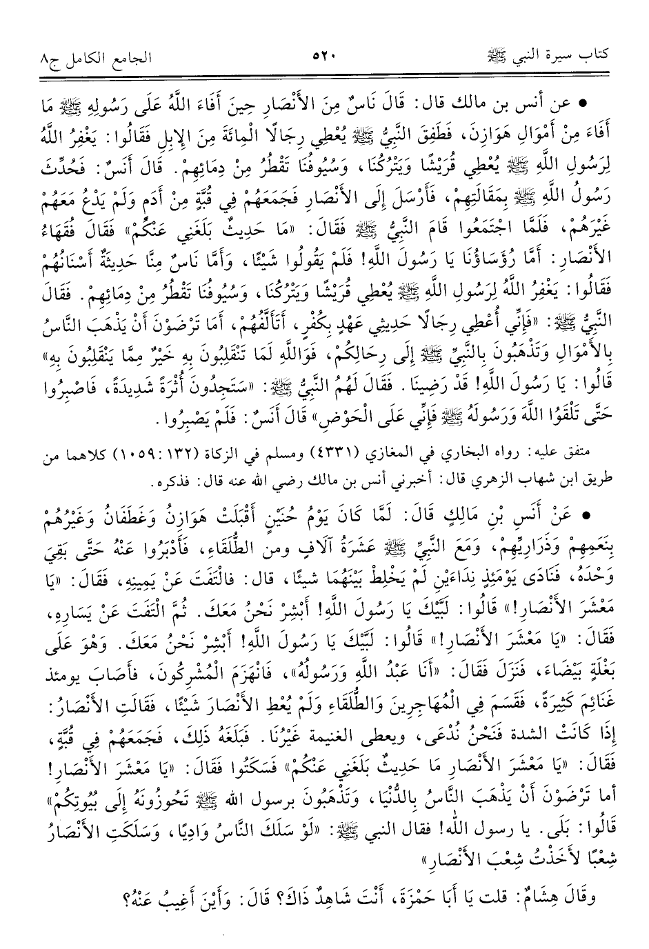 • عَنْ أَنَسِ بْنِ مَالِكٍ قَالَ: لَمَّا كَانَ يَوْمُ حُنينٍ أَقْبَلَتْ هَوَازِنُ وَغَطَفَانُ وَغَيْرُهُمْ بِنَعَمِهِمْ وَذَرَارِيِّهِمْ، وَمَعَ النَّبِيِّ - صلى الله عليه وسلم - عَشَرَةُ آلَافٍ ومن الطُّلَقَاءِ، فَأَدْبَرُوا عَنْهُ حَتَّى بَقِيَ وَحْدَهُ، فَنَادَى يَوْمَئِذٍ نِدَاءَيْنِ لَمْ يَخْلِطْ بَيْنَهُمَا شيئًا، قال: فالْتَفَتَ عَنْ يَمِينِهِ، فَقَالَ: "يَا مَعْشَرَ الأَنْصَارِ! " قَالُوا: لَبَّيْكَ يَا رَسُولَ اللَّهِ! أَبْشِرْ نَحْنُ مَعَكَ. ثُمَّ الْتَفَتَ عَنْ يَسَارِهِ، فَقَالَ: "يَا مَعْشَرَ الأَنْصَارِ! " قَالُوا: لبّيْكَ يَا رَسُولَ اللَّهِ! أَبْشِرْ نَحْنُ مَعَكَ. وَهْوَ عَلَى بَغْلَةٍ بَيْضَاءَ، فَنَزَلَ فَقَالَ: "أَنَا عَبْدُ اللَّهِ وَرَسُولُهُ"، فَانْهَزَمَ الْمُشْرِكُونَ، فأَصَابَ يومئذ غَنَائِمَ كَثِيرَةً، فَقَسَمَ فِي الْمُهَاجِرِينَ وَالطُّلَقَاءِ وَلَمْ يُعْطِ الأَنْصَارَ شَيْئًا، فَقَالَتِ الأَنْصَارُ: إِذَا كَانَتْ الشدة فنَحْنُ نُدْعَى، ويعطى الغنيمة غَيْرُنَا. فَبَلَغَهُ ذَلِكَ، فَجَمَعَهُمْ فِي قُبَّةٍ، فَقَالَ: "يَا مَعْشَرَ الأَنْصَارِ مَا حَدِيثٌ بَلَغَنِي عَنْكُمْ" فَسَكَتُوا فَقَالَ: "يَا مَعْشَرَ الأَنْصَارِ! أما تَرْضَوْنَ أَنْ يَذْهَبَ النَّاسُ بِالدُّنْيَا، وَتَذْهَبُونَ برسول الله - صلى الله عليه وسلم - تَحُوزُونَهُ إِلَى بُيُوتِكُمْ" قَالُوا: بَلَى. يا رسول الله! فقال النبي - صلى الله عليه وسلم -: "لَوْ سَلَكَ النَّاسُ وَادِيًا، وَسَلَكَتِ الأَنْصَارُ شِعْبًا لأَخَذْتُ شِعْبَ الأَنْصَارِ".