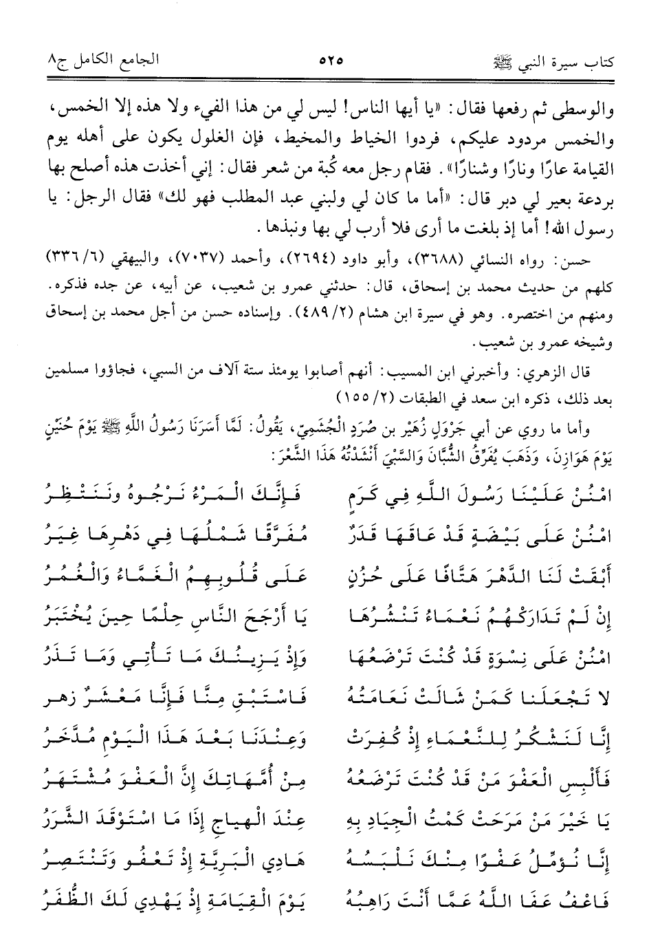 وأما ما روي عن أبي جَرْوَلٍ زُهَيْر بن صُرَدٍ الْجُشَمِيّ، يَقُولُ: لَمَّا أَسَرَنَا رَسُولُ اللَّهِ - صلى الله عليه وسلم - يَوْمَ حُنينٍ يَوْمَ هَوَازِنَ، وَذَهَبَ يُفَرِّقُ الشُّبَّانَ وَالسَّبْيَ أَنْشَدْتُهُ هَذَا الشَّعْرَ: