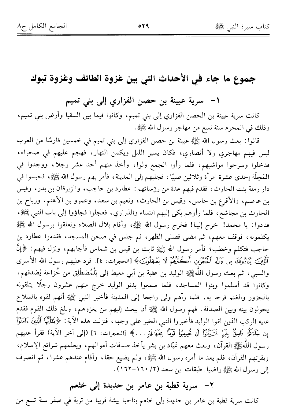 قالوا: بعث رسول الله - صلى الله عليه وسلم - عيينة بن حصن الفزاري إلى بني تميم في خمسين فارسًا من العرب ليس فيهم مهاجري ولا أنصاري، فكان يسير الليل ويكمن النهار، فهجم عليهم في صحراء، فدخلوا وسرحوا مواشيهم، فلما رأوا الجمع ولوا، وأخذ منهم أحد عشر رجلا، ووجدوا في المَحِلّة إحدى عشرة امرأة وثلاثين صبيًا، فجلبهم إلى المدينة، فأمر بهم رسول الله - صلى الله عليه وسلم -، فحبسوا في دار رملة بنت الحارث، فقدم فيهم عدة من رؤسائهم: عطارد بن حاجب، والزبرقان بن بدر، وقيس بن عاصم، والأقرع بن حابس، وقيس بن الحارث، ونعيم بن سعد، وعمرو بن الأهتم، ورباح بن الحارث بن مجاشع، فلما رأوهم بكى إليهم النساء والذراري، فعجلوا فجاؤوا إلى باب النبي - صلى الله عليه وسلم -، فنادوا: يا محمد! اخرج إلينا! فخرج رسول الله - صلى الله عليه وسلم -، وأقام بلال الصلاة وتعلقوا برسول الله - صلى الله عليه وسلم - يكلمونه، فوقف معهم، ثم مضى فصلى الظهر، ثم جلس في صحن المسجد، فقدموا عطارد بن حاجب فتكلم وخطب؛ فأمر رسول الله - صلى الله عليه وسلم - ثابت بن قيس بن شماس فأجابهم، ونزل فيهم: {إِنَّ الَّذِينَ يُنَادُونَكَ مِنْ وَرَاءِ الْحُجُرَاتِ أَكْثَرُهُمْ لَا يَعْقِلُونَ} [الحجرات: ٤]. فرد عليهم رسول الله الأسرى والسبي، ثم بعث رسول الله - صلى الله عليه وسلم - الوليد بن عقبة بن أبي معيط إلى بَلْمُصْطَلِق من خُزاعة يُصَدقهم، وكانوا قد أسلموا وبنوا المساجد، فلما سمعوا بدنو الوليد خرج منهم عشرون رجلًا يتلقونه بالجزور والغنم فرحا به، فلما رآهم ولى راجعا إلى المدينة فأخبر النبي - صلى الله عليه وسلم - أنهم لقوه بالسلاح يحولون بينه وبين الصدقة. فهم رسول الله - صلى الله عليه وسلم - أن يبعث إليهم من يغزوهم، وبلغ ذلك القوم فقدم عليه الركب الذين لقوا الوليد فأخبروا النبي الخبر على وجهه، فنزلت هذه الآية: {يَاأَيُّهَا الَّذِينَ آمَنُوا إِنْ جَاءَكُمْ فَاسِقٌ بِنَبَإٍ فَتَبَيَّنُوا أَنْ تُصِيبُوا قَوْمًا بِجَهَالَةٍ ... } [الحجرات: ٦] (إلى آخر الآية) فقرأ عليهم رسول الله - صلى الله عليه وسلم - القرآن، وبعث معهم عَبّاد بن بشر يأخذ صدقات أموالهم، ويعلمهم شرائع الإسلام، ويقرئهم القرآن، فلم يعد ما أمره رسول الله - صلى الله عليه وسلم -، ولم يضيع حقا، وأقام عندهم عشرا، ثم انصرف إلى رسول الله - صلى الله عليه وسلم - راضيا. طبقات ابن سعد (٢/ ١٦٠ - ١٦٢).