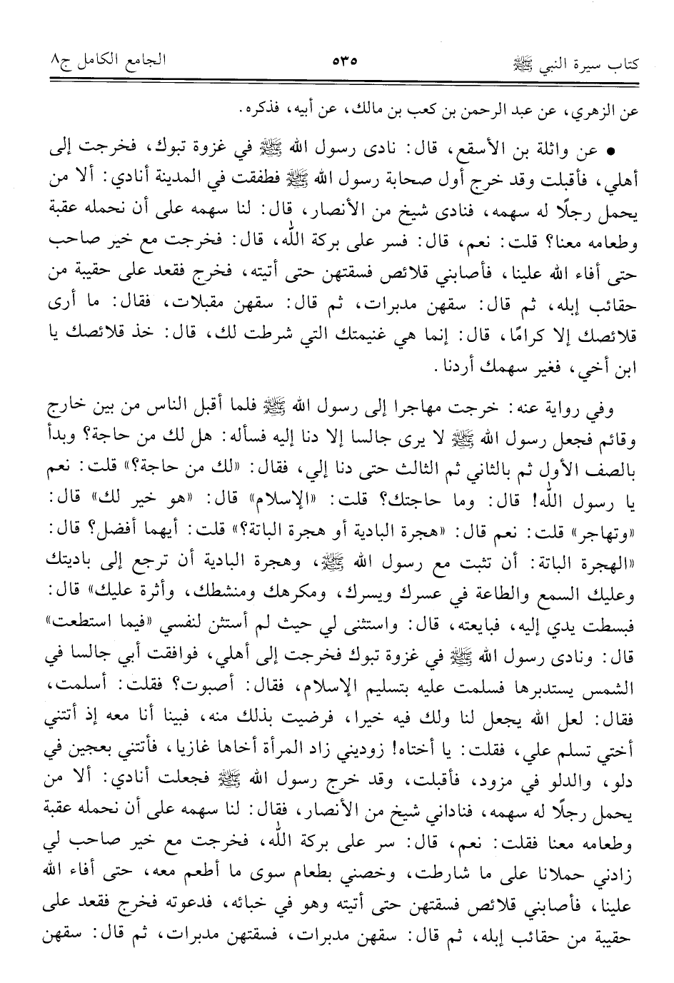• عن واثلة بن الأسقع، قال: نادى رسول الله - صلى الله عليه وسلم - في غزوة تبوك، فخرجت إلى أهلي، فأقبلت وقد خرج أول صحابة رسول الله - صلى الله عليه وسلم - فطفقت في المدينة أنادي: ألا من يحمل رجلًا له سهمه، فنادى شيخ من الأنصار، قال: لنا سهمه على أن نحمله عقبة وطعامه معنا؟ قلت: نعم، قال: فسر على بركة الله، قال: فخرجت مع خير صاحب حتى أفاء الله علينا، فأصابني قلائص فسقتهن حتى أتيته، فخرج فقعد على حقيبة من حقائب إبله، ثم قال: سقهن مدبرات، ثم قال: سقهن مقبلات، فقال: ما أرى قلائصك إلا كرامًا، قال: إنما هي غنيمتك التي شرطت لك، قال: خذ قلائصك يا ابن أخي، فغير سهمك أردنا.