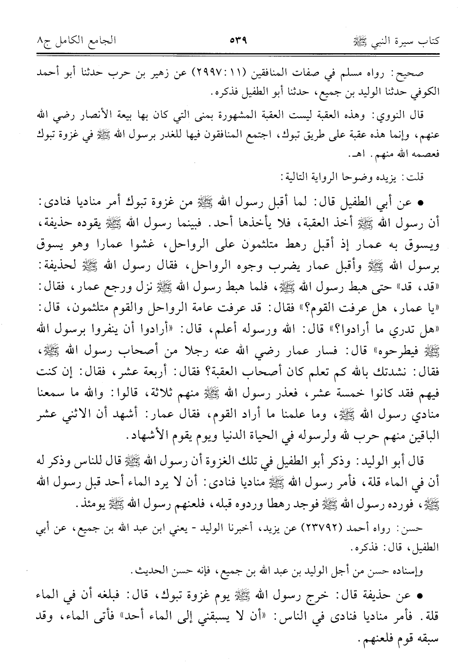 • عن أبي الطفيل قال: لما أقبل رسول الله - صلى الله عليه وسلم - من غزوة تبوك أمر مناديا فنادى: أن رسول الله - صلى الله عليه وسلم - أخذ العقبة، فلا يأخذها أحد. فبينما رسول الله - صلى الله عليه وسلم - يقوده حذيفة، ويسوق به عمار إذ أقبل رهط متلثمون على الرواحل، غشوا عمارا وهو يسوق برسول الله - صلى الله عليه وسلم - وأقبل عمار يضرب وجوه الرواحل، فقال رسول الله - صلى الله عليه وسلم - لحذيفة: "قد، قد" حتى هبط رسول الله - صلى الله عليه وسلم -، فلما هبط رسول الله - صلى الله عليه وسلم - نزل ورجع عمار، فقال: "يا عمار، هل عرفت القوم؟ " فقال: قد عرف عامة الرواحل والقوم متلثمون، قال: "هل تدري ما أرادوا؟ " قال: الله ورسوله أعلم، قال: "أرادوا أن ينفروا برسول الله - صلى الله عليه وسلم - فيطرحوه " قال: فسار عمار - رضي الله عنه - رجلا من أصحاب رسول الله - صلى الله عليه وسلم -، فقال: نشدتك بالله كم تعلم كان أصحاب العقبة؟ فقال: أربعة عشر، فقال: إن كنت فيهم فقد كانوا خمسة عشر، فعذر رسول الله - صلى الله عليه وسلم - منهم ثلاثة، قالوا: والله ما سمعنا منادي رسول الله - صلى الله عليه وسلم -، وما علمنا ما أراد القوم، فقال عمار: أشهد أن الاثني عشر الباقين منهم حرب لله ولرسوله في الحياة الدنيا ويوم يقوم الأشهاد.