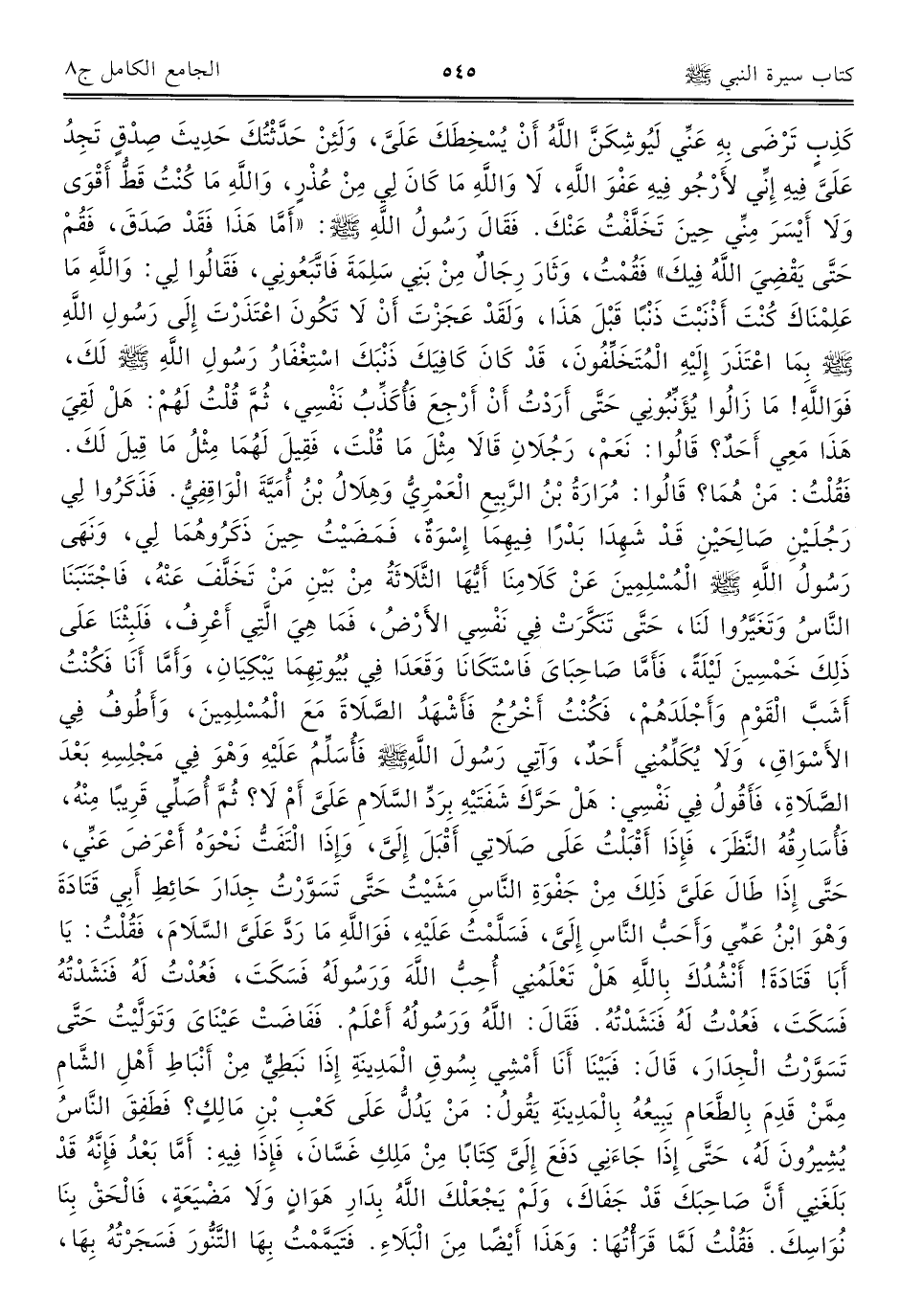 كَذِب تَرْضَى بهِ عَنِّي لَيُوشِكَنَّ اللَّهُ أَنْ يُسْخِطَكَ عَلَيَّ، وَلَئِنْ حَدَّثْتُكَ حَدِيثَ صِدْقٍ تَجِدُ عَلَيَّ فِيهِ إِنِّي لأَرْجُو فِيهِ عَفْوَ اللَّهِ، لَا وَاللَّهِ مَا كَانَ لِي مِنْ عُذْرٍ، وَاللَّهِ مَا كُنْتُ قَطُّ أَقْوَى وَلَا أَيْسَرَ مِنِّي حِينَ تَخَلَّقْتُ عَنْكَ. فَقَال رَسُول اللَّهِ - صلى الله عليه وسلم -: "أَمَّا هَذَا فَقَدْ صَدَقَ، فَقُمْ حَتَّى يَقْضيَ اللَّهُ فِيكَ" فَقُمْتُ، وَثَارَ رِجَالٌ مِنْ بَنِي سَلِمَةَ فَاتَّبَعُونِي، فَقَالُوا لِي: وَاللَّهِ مَا عَلِمْنَاكَ كُنْتَ أَذْنَبْتَ ذَنْبًا قَبْلَ هَذَا، وَلَقَدْ عَجَزْتَ أَنْ لَا تَكُونَ اعْتَذَرْتَ إِلَى رَسُول اللَّهِ - صلى الله عليه وسلم - بِمَا اعْتَذَرَ إِلَيْهِ الْمُتَخَلِّفُونَ، قَدْ كَانَ كَافِيَكَ ذَنْبَكَ اسْتِغْفَارُ رَسُول اللَّهِ - صلى الله عليه وسلم - لَكَ، فَوَاللَّهِ! مَا زَالُوا يُؤَنِّبُونِي حَتَّى أَرَدْتُ أَنْ أَرْجِعَ فَأُكَذِّبُ نَفْسِي، ثُمَّ قُلْتُ لَهُمْ: هَلْ لَقِيَ هَذَا مَعِي أَحَدٌ؟ قَالُوا: نَعَمْ، رَجُلَانِ قَالَا مِثْلَ مَا قُلْتَ، فَقِيلَ لَهُمَا مِثْلُ مَا قِيلَ لَكَ. فَقُلْتُ: مَنْ هُمَا؟ قَالُوا: مُرَارَةُ بْنُ الرَّبِيعِ الْعَمْرِيُّ وَهِلَال بْنُ أُمَيَّةَ الْوَاقِفِيُّ. فَذَكَرُوا لِي رَجُلَيْنِ صَالِحَيْنِ قَدْ شَهِدَا بَدْرًا فِيهِمَا إِسْوَةٌ، فَمَضَيْتُ حِينَ ذَكَرُوهُمَا لِي، وَنَهَى رَسُول اللَّهِ - صلى الله عليه وسلم - الْمُسْلِمِينَ عَنْ كَلَامِنَا أَيُّهَا الثَّلَاثَةُ مِنْ بَيْنِ مَنْ تَخَلَّفَ عَنْهُ، فَاجْتَنبنَا النَّاسُ وَتَغَيَّرُوا لَنَا، حَتَّى تَنكَّرَتْ فِي نَفْسِي الأَرْضُ، فَمَا هِيَ الَّتِي أَعْرِفُ، فَلَبِثْنَا عَلَى ذَلِكَ خَمْسِينَ لَيْلَةً، فَأَمَّا صَاحِبَايَ فَاسْتَكَانَا وَقَعَدَا فِي بُيُوتِهِمَا يَبْكِيَانِ، وَأَمَّا أَنَا فَكُنْتُ أَشَبَّ الْقَوْمِ وَأَجْلَدَهُمْ، فَكُنْتُ أَخْرُجُ فَأَشْهَدُ الصَّلَاةَ مَعَ الْمُسْلِمِينَ، وَأَطُوفُ فِي الأَسْوَاقِ، وَلَا يُكَلِّمُنِي أَحَدٌ، وَآتِي رَسُولَ اللَّهِ - صلى الله عليه وسلم - فَأُسَلِّمُ عَلَيْهِ وَهْوَ في مَجْلِسِهِ بَعْدَ الصَّلَاةِ، فَأَقُول فِي نَفْسِي: هَلْ حَرَّكَ شَفَتَيْهِ بِرَدِّ السَّلَامِ عَلَيَّ أَمْ لَا؟ ثُمَّ أُصَلِّي قَرِيبًا مِنْهُ، فَأُسَارِقُهُ النَّظَرَ، فَإِذَا أَقْبَلْتُ عَلَى صَلَاتِي أَقْبَلَ إِلَيَّ، وِإذَا الْتَفَتُّ نَحْوَهُ أَعْرَضَ عَنِّي، حَتَّى إِذَا طَالَ عَلَيَّ ذَلِكَ مِنْ جَفْوَةِ النَّاسِ مَشَيْتُ حَتَّى تَسَوَّرْتُ جِدَارَ حَائِطِ أَبِي قَتَادَةَ وَهْوَ ابْنُ عَمِّي وَأَحَبُّ النَّاسِ إِلَيَّ، فَسَلَّمْتُ عَلَيْهِ، فَوَاللَّهِ مَا رَدَّ عَلَيَّ السَّلَامَ، فَقُلْتُ: يَا أَبَا قَتَادَةَ! أَنْشُدُكَ بِاللَّهِ هَلْ تَعْلَمُنِي أُحِبُّ اللَّهَ وَرَسُولَهُ فَسَكَتَ، فَعُدْتُ لَهُ فَنَشَدْتُهُ فَسَكَتَ، فَعُدْتُ لَهُ فَنَشَدْتُهُ. فَقَالَ: اللَّهُ وَرَسُولُهُ أَعْلَمُ. فَفَاضَتْ عَيْنَايَ وَتَوَلَّيْتُ حَتَّى تَسَوَّرْتُ الْجِدَارَ، قَالَ: فَبَيْنَا أَنَا أَمْشِي بِسُوقِ الْمَدِينَةِ إِذَا نَبَطِيٌّ مِنْ أَنْبَاطِ أَهْلِ الشَّامِ مِمَّنْ قَدِمَ بِالطَّعَامِ يَبِيعُهُ بِالْمَدِينَةِ يَقُولُ: مَنْ يَدُلُّ عَلَى كَعْبِ بْنِ مَالِكٍ؟ فَطَفِقَ النَّاسُ يُشِيرُونَ لَهُ، حَتَّى إِذَا جَاءَنِي دَفَعَ إِلَيَّ كِتَابًا مِنْ مَلِكِ غَسَّانَ، فَإِذَا فِيهِ: أَمَّا بَعْدُ فَإِنَّهُ قَدْ بَلَغَنِي أَنَّ صَاحِبَكَ قَدْ جَفَاكَ، وَلَمْ يَجْعَلْكَ اللَّهُ بِدَارِ هَوَانٍ وَلَا مَضْيَعَةٍ، فَالْحَقْ بِنَا نُوَاسِكَ. فَقُلْتُ لَمَّا قَرَأتُهَا: وَهَذَا أَيْضًا مِنَ الْبَلَاءِ. فَتيَمَّمْتُ بِهَا التَّنُّورَ فَسَجَرْتُهُ بِهَا،