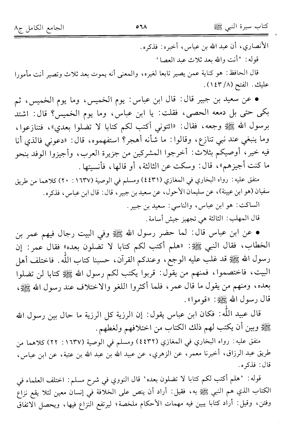 متفق عليه: رواه البخاري في المغازي (٤٤٣٢) ومسلم في الوصية (١٦٣٧: ٢٢) كلاهما من طريق عبد الرزاق، أخبرنا معمر، عن الزهري، عن عبيد الله بن عبد الله بن عتبة، عن ابن عباس، قال: فذكره.