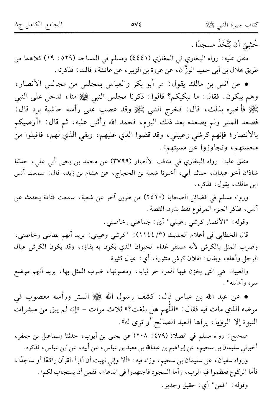 • عن أنس بن مالك يقول: مر أبو بكر والعباس بمجلس من مجالس الأنصار، وهم يبكون. فقال: ما يبكيكم؟ قالوا: ذكرنا مجلس النبي - صلى الله عليه وسلم - منا، فدخل على النبي - صلى الله عليه وسلم - فأخبره بذلك، قال: فخرج النبي - صلى الله عليه وسلم - وقد عصب على رأسه حاشية برد قال: فصعد المنبر ولم يصعده بعد ذلك اليوم، فحمد الله وأثنى عليه، ثم قال: "أوصيكم بالأنصار؛ فإنهم كرشي وعيبتي، وقد قضوا الذي عليهم، وبقي الذي لهم، فاقبلوا من محسنهم، وتجاوزوا عن مسيئهم".