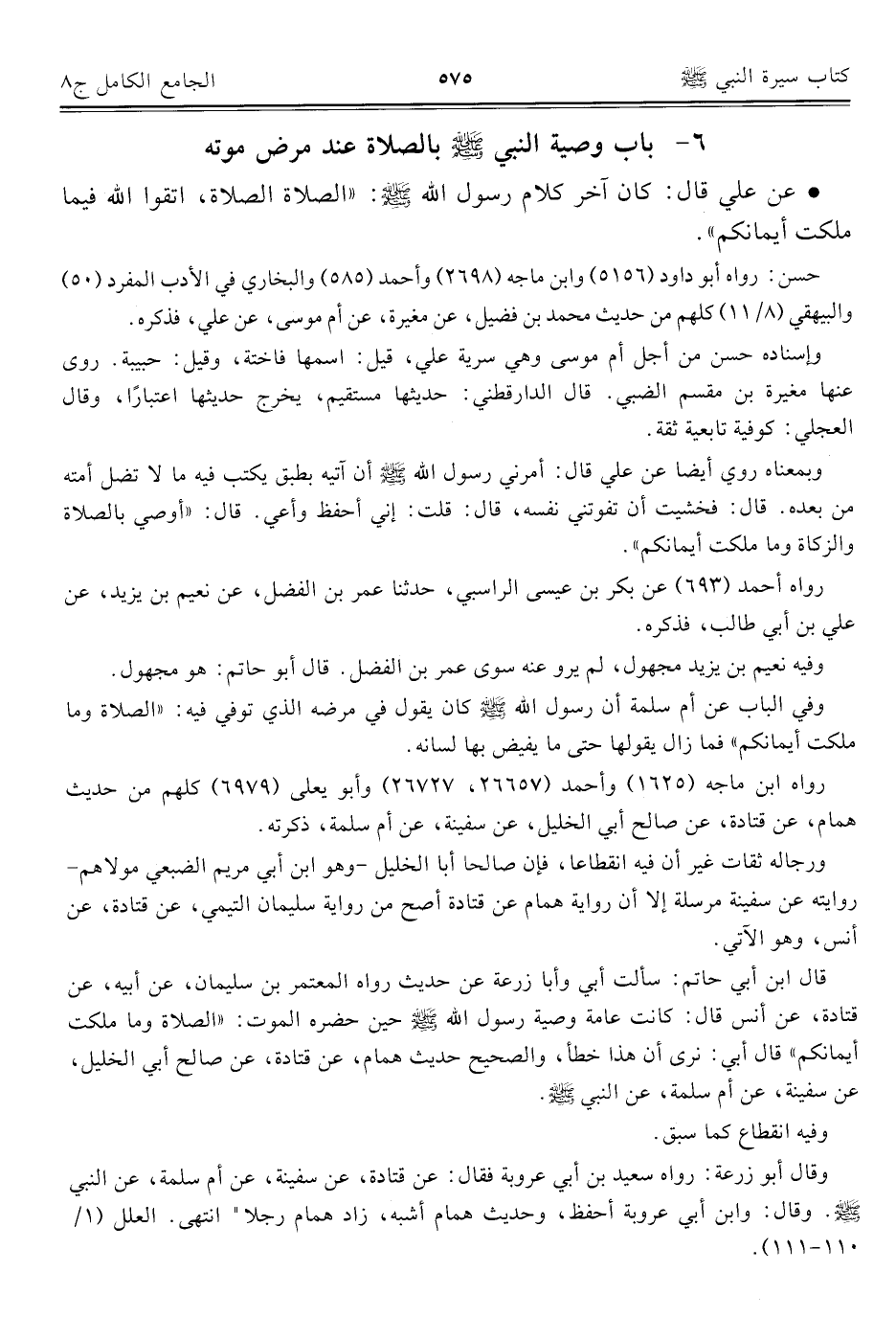 • عن علي قال: كان آخر كلام رسول الله - صلى الله عليه وسلم -: "الصلاة الصلاة، اتقوا الله فيما ملكت أيمانكم".