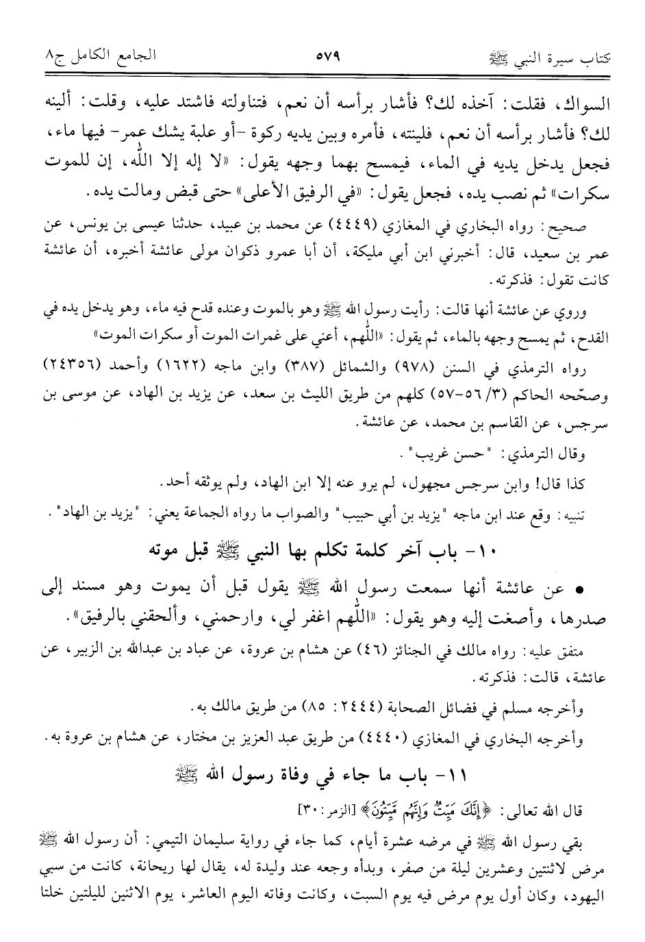 السواك، فقلت: آخذه لك؟ فأشار برأسه أن نعم، فتناولته فاشتد عليه، وقلت: ألينه لك؟ فأشار برأسه أن نعم، فلينته، فأمره وبين يديه ركوة - أو علبة يشك عمر - فيها ماء، فجعل يدخل يديه في الماء، فيمسح بهما وجهه يقول: "لا إله إلا الله، إن للموت سكرات" ثم نصب يده، فجعل يقول: "في الرفيق الأعلى" حتى قبض ومالت يده.