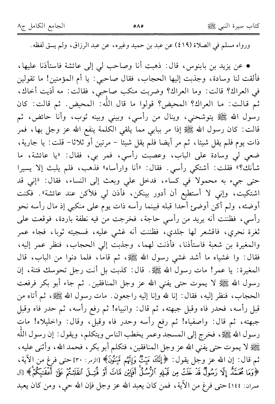 • عن يزيد بن بابنوس، قال: ذهبت أنا وصاحب لي إلى عائشة فاستأذنا عليها، فألقت لنا وسادة، وجذبت إليها الحجاب، فقال صاحبي: يا أم المؤمنين! ما تقولين في العراك؟ قالت: وما العراك؟ وضربت منكب صاحبي، فقالت: مه آذيت أخاك، ثم قالت: ما العراك؟ المحيض؟ قولوا ما قال الله: المحيض. ثم قالت: كان رسول الله - صلى الله عليه وسلم - يتوشحني، وينال من رأسي، وبيني وبينه ثوب، وأنا حائض، ثم قالت: كان رسول الله - صلى الله عليه وسلم - إذا مر ببابي مما يلقي الكلمة ينفع الله عز وجل بها، فمر ذات يوم فلم يقل شيئا، ثم مر أيضا فلم يقل شيئا - مرتين أو ثلاثا - قلت: يا جارية، ضعي لي وسادة على الباب، وعصبت رأسي، فمر بي، فقال: "يا عائشة، ما شأنك؟ " فقلت: أشتكي رأسي. فقال: "أنا وارأساه" فذهب، فلم يلبث إلا يسيرا حتى جيء به محمولا في كساء، فدخل علي وبعث إلى النساء، فقال: "إني قد اشتكيت، وإني لا أستطيع أن أدور بينكن، فأذن لي فلأكن عند عائشة". فكنت أوضئه، ولم أكن أوضئ أحدا قبله فبينما رأسه ذات يوم على منكبي إذ مال رأسه نحو رأسي، فظننت أنه يريد من رأسي حاجة، فخرجت من فيه نطفة باردة، فوقعت على ثغرة نحري، فاقشعر لها جلدي، فظننت أنه غشي عليه، فسجيته ثوبا، فجاء عمر والمغيرة بن شعبة فاستأذنا، فأذنت لهما، وجذبت إلي الحجاب، فنظر عمر إليه، فقال: وا غشياه ما أشد غشي رسول الله - صلى الله عليه وسلم -، ثم قاما، فلما دنوا من الباب، قال المغيرة: يا عمر! مات رسول الله - صلى الله عليه وسلم -. قال: كذبت بل أنت رجل تحوسك فتنة، إن رسول الله - صلى الله عليه وسلم - لا يموت حتى يفني الله عز وجل المنافقين. ثم جاء أبو بكر فرفعت الحجاب، فنظر إليه، فقال: إنا لله وإنا إليه راجعون. مات رسول الله - صلى الله عليه وسلم -، ثم أتاه من قبل رأسه، فحدر فاه وقبل جبهته، ثم قال: وانبياه! ثم رفع رأسه، ثم حدر فاه وقبل جبهته، ثم قال: واصفياه! ثم رفع رأسه وحدر فاه وقبل، وقال: واخليلاه! مات رسول الله - صلى الله عليه وسلم -، فخرج إلى المسجد وعمر يخطب الناس ويتكلم، ويقول: إن رسول الله - صلى الله عليه وسلم - لا يموت حتى يفني الله عز وجل المنافقين، فتكلم أبو بكر، فحمد الله، وأثنى عليه، ثم قال: إن الله عز وجل يقول: {إِنَّكَ مَيِّتٌ وَإِنَّهُمْ مَيِّتُونَ} [الزمر: ٣٠] حتى فرغ من الآية، {وَمَا مُحَمَّدٌ إِلَّا رَسُولٌ قَدْ خَلَتْ مِنْ قَبْلِهِ الرُّسُلُ أَفَإِنْ مَاتَ أَوْ قُتِلَ انْقَلَبْتُمْ عَلَى أَعْقَابِكُمْ} [آل عمران: ١٤٤] حتى فرغ من الآية، فمن كان يعبد الله عز وجل فإن الله حي، ومن كان يعبد