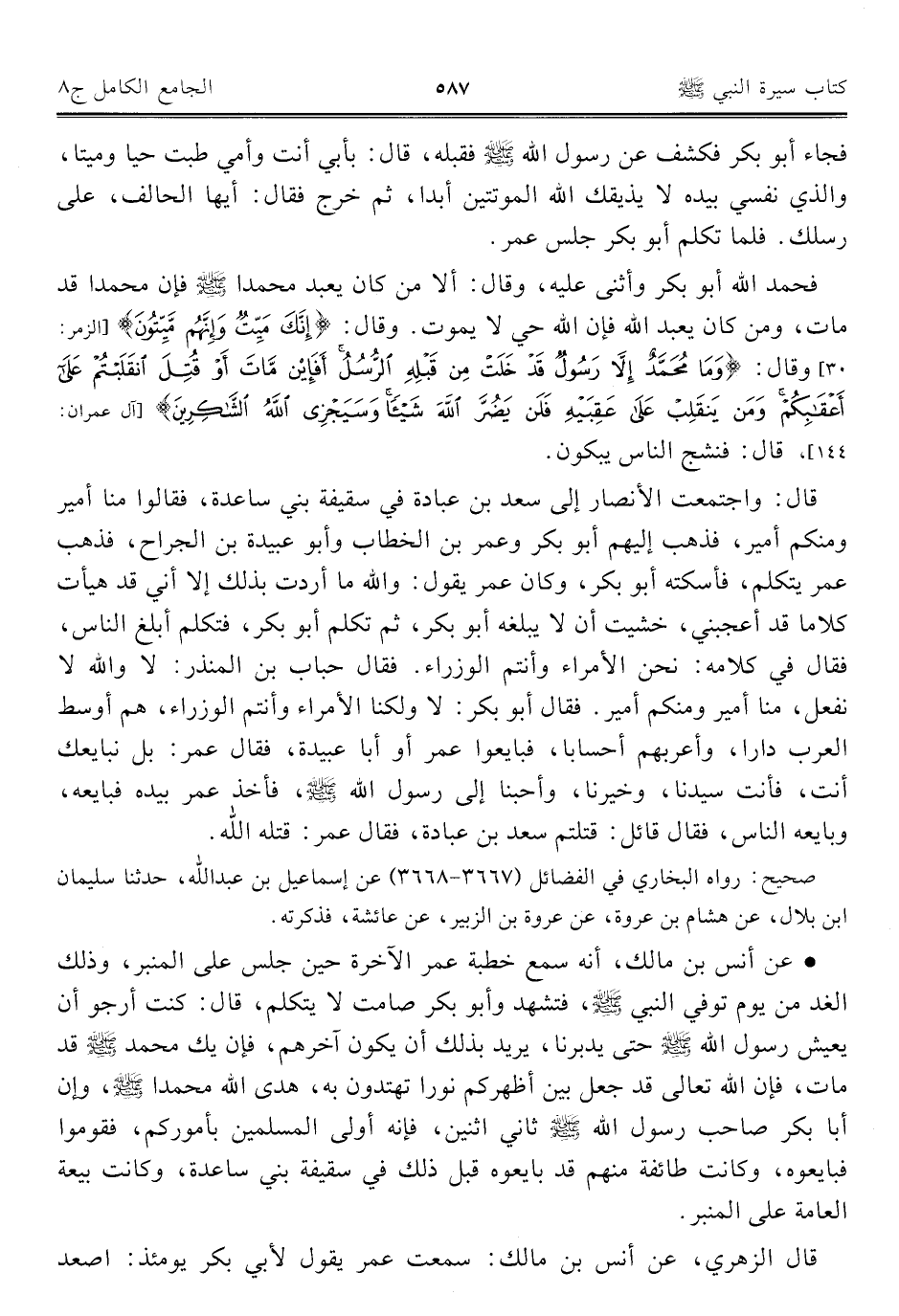 • عن أنس بن مالك، أنه سمع خطبة عمر الآخرة حين جلس على المنبر، وذلك الغد من يوم توفي النبي - صلى الله عليه وسلم -، فتشهد وأبو بكر صامت لا يتكلم، قال: كنت أرجو أن يعيش رسول الله - صلى الله عليه وسلم - حتى يدبرنا، يريد بذلك أن يكون آخرهم، فإن يك محمد - صلى الله عليه وسلم - قد مات، فإن الله تعالى قد جعل بين أظهركم نورا تهتدون به، هدى الله محمدا - صلى الله عليه وسلم -، وإن أبا بكر صاحب رسول الله - صلى الله عليه وسلم - ثاني اثنين، فإنه أولى المسلمين بأموركم، فقوموا فبايعوه، وكانت طائفة منهم قد بايعوه قبل ذلك في سقيفة بني ساعدة، وكانت بيعة العامة على المنبر.
