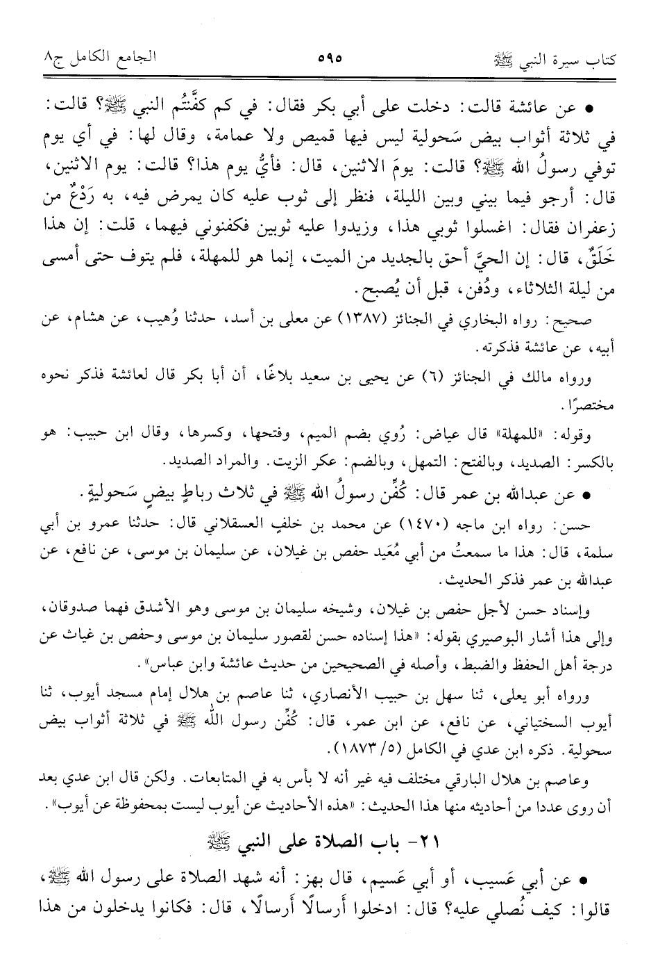 ورواه أبو يعلى، ثنا سهل بن حبيب الأنصاري، ثنا عاصم بن هلال إمام مسجد أيوب، ثنا أيوب السختياني، عن نافع، عن ابن عمر، قال: كُفِّن رسول الله - صلى الله عليه وسلم - في ثلاثة أثواب بيض سحولية. ذكره ابن عدي في الكامل (٥/ ١٨٧٣).