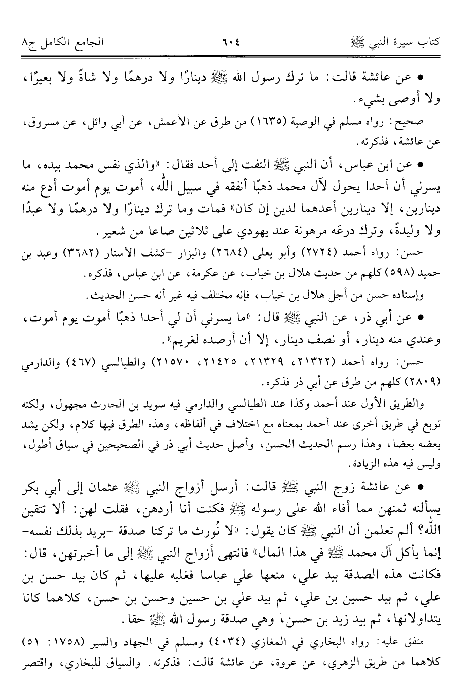 • عن عائشة زوج النبي - صلى الله عليه وسلم - قالت: أرسل أزواج النبي - صلى الله عليه وسلم - عثمان إلى أبي بكر يسألنه ثمنهن مما أفاء الله على رسوله - صلى الله عليه وسلم - فكنت أنا أردهن، فقلت لهن: ألا تتقين الله؟ ألم تعلمن أن النبي - صلى الله عليه وسلم - كان يقول: "لا نُورث ما تركنا صدقة - يريد بذلك نفسه - إنما يأكل آل محمد - صلى الله عليه وسلم - في هذا المال" فانتهى أزواج النبي - صلى الله عليه وسلم - إلى ما أخبرتهن، قال: فكانت هذه الصدقة بيد علي، منعها علي عباسا فغلبه عليها، ثم كان بيد حسن بن علي، ثم بيد حسين بن علي، ثم بيد علي بن حسين وحسن بن حسن، كلاهما كانا يتداولانها، ثم بيد زيد بن حسن، وهي صدقة رسول الله - صلى الله عليه وسلم - حقا.
