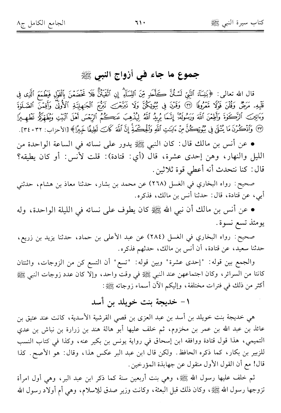 • عن أنس بن مالك أن نبي الله - صلى الله عليه وسلم - كان يطوف على نسائه في الليلة الواحدة، وله يومئذ تسع نسوة.