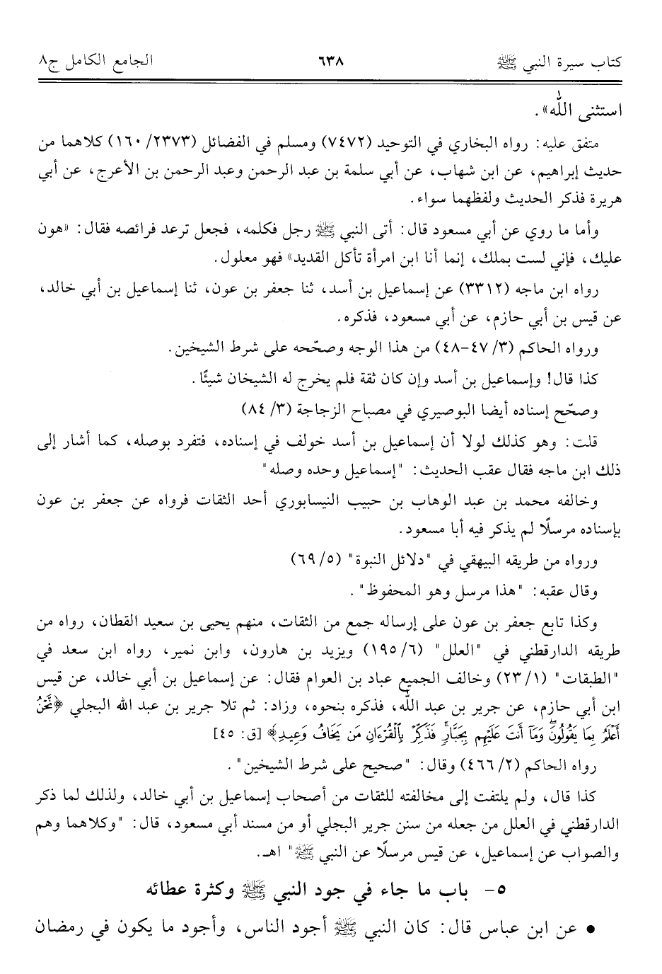 كذا قال، ولم يلتفت إلى مخالفته للثقات من أصحاب إسماعيل بن أبي خالد، ولذلك لما ذكر الدارقطني في العلل من جعله من سنن جرير البجلي أو من مسند أبي مسعود، قال: "وكلاهما وهم والصواب عن إسماعيل، عن قيس مرسلًا عن النبي - صلى الله عليه وسلم -" اهـ.
