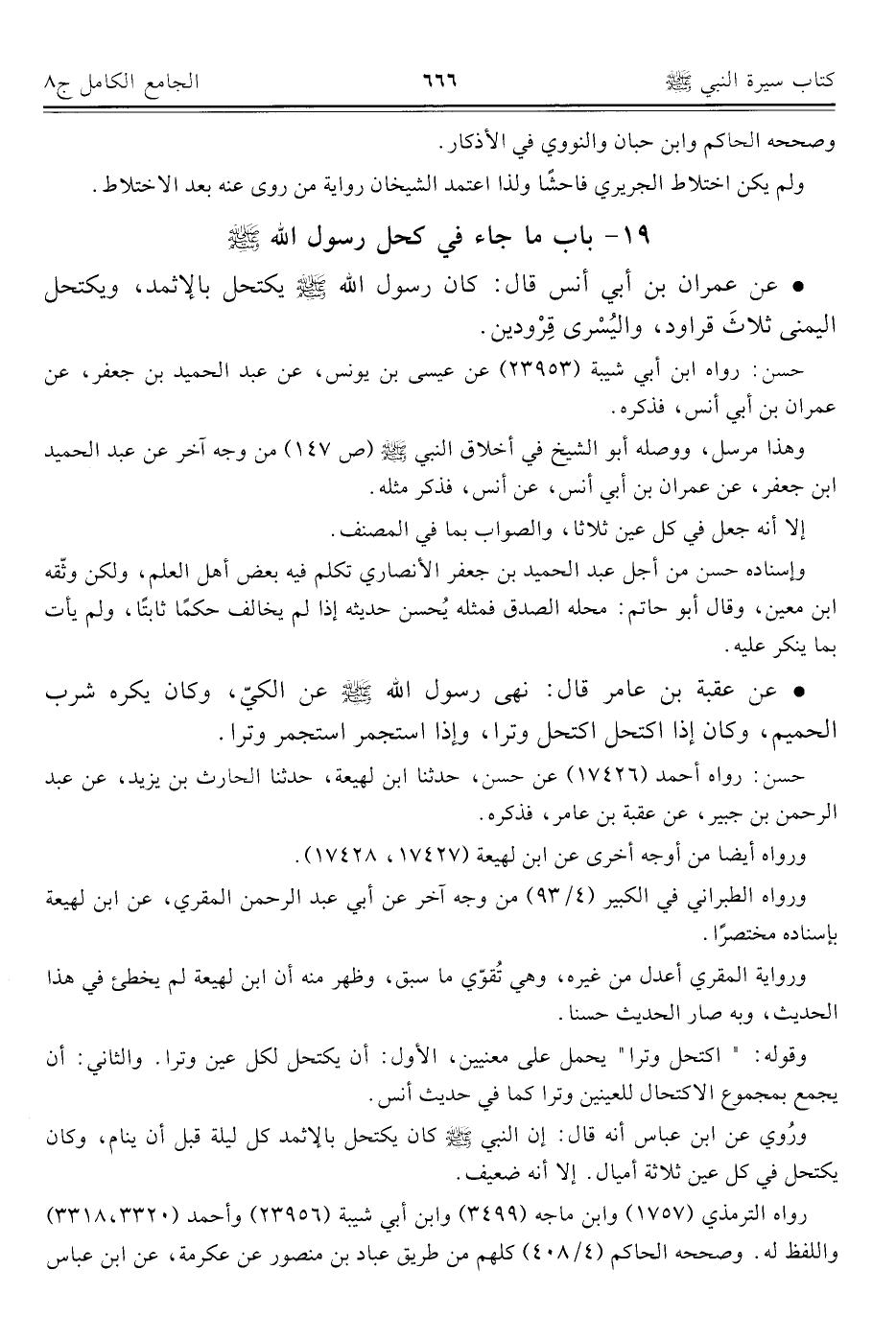 • عن عقبة بن عامر قال: نهى رسول الله - صلى الله عليه وسلم - عن الكيّ، وكان يكره شرب الحميم، وكان إذا اكتحل اكتحل وترا، وإذا استجمر استجمر وترا.