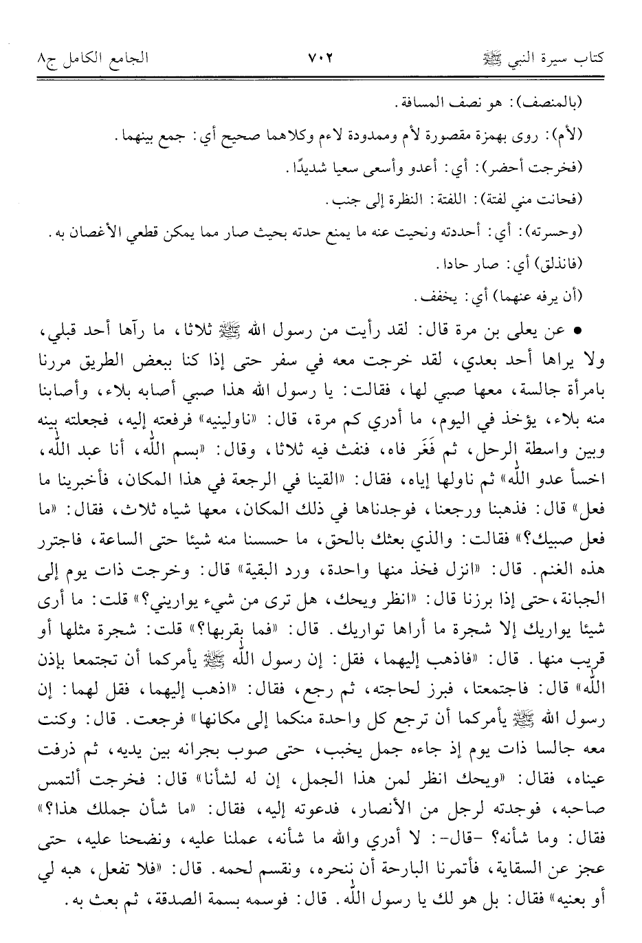 • عن يعلى بن مرة قال: لقد رأيت من رسول الله - صلى الله عليه وسلم - ثلاثا، ما رآها أحد قبلي، ولا يراها أحد بعدي، لقد خرجت معه في سفر حتى إذا كنا ببعض الطريق مررنا بامرأة جالسة، معها صبي لها، فقالت: يا رسول الله هذا صبي أصابه بلاء، وأصابنا منه بلاء، يؤخذ في اليوم، ما أدري كم مرة، قال: "ناولينيه" فرفعته إليه، فجعلته بينه وبين واسطة الرحل، ثم فَغَر فاه، فنفث فيه ثلاثا، وقال: "بسم الله، أنا عبد الله، اخسأ عدو الله" ثم ناولها إياه، فقال: "القينا في الرجعة في هذا المكان، فأخبرينا ما فعل" قال: فذهبنا ورجعنا، فوجدناها في ذلك المكان، معها شياه ثلاث، فقال: "ما فعل صبيك؟ " فقالت: والذي بعثك بالحق، ما حسسنا منه شيئا حتى الساعة، فاجترر هذه الغنم. قال: "انزل فخذ منها واحدة، ورد البقية" قال: وخرجت ذات يوم إلى الجبانة، حتى إذا برزنا قال: "انظر ويحك، هل ترى من شيء يواريني؟ " قلت: ما أرى شيئا يواريك إلا شجرة ما أراها تواريك. قال: "فما بقربها؟ " قلت: شجرة مثلها أو قريب منها. قال: "فاذهب إليهما، فقل: إن رسول الله - صلى الله عليه وسلم - يأمركما أن تجتمعا بإذن الله" قال: فاجتمعتا، فبرز لحاجته، ثم رجع، فقال: "اذهب إليهما، فقل لهما: إن رسول الله - صلى الله عليه وسلم - يأمركما أن ترجع كل واحدة منكما إلى مكانها" فرجعت. قال: وكنت معه جالسا ذات يوم إذ جاءه جمل يخبب، حتى صوب بجرانه بين يديه، ثم ذرفت عيناه، فقال: "ويحك انظر لمن هذا الجمل، إن له لشأنا" قال: فخرجت ألتمس صاحبه، فوجدته لرجل من الأنصار، فدعوته إليه، فقال: "ما شأن جملك هذا؟ " فقال: وما شأنه؟ -قال-: لا أدري والله ما شأنه، عملنا عليه، ونضحنا عليه، حتى عجز عن السقاية، فأتمرنا البارحة أن ننحره، ونقسم لحمه. قال: "فلا تفعل، هبه لي أو بعنيه" فقال: بل هو لك يا رسول الله. قال: فوسمه بسمة الصدقة، ثم بعث به.
