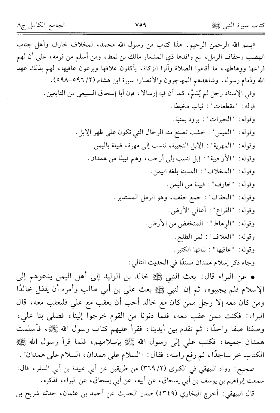 • عن البراء قال: بعث النبي - صلى الله عليه وسلم - خالد بن الوليد إلى أهل اليمن يدعوهم إلى الإسلام فلم يجيبوه، ثم إن النبي - صلى الله عليه وسلم - بعث علي بن أبي طالب وأمره أن يقفل خالدًا ومن كان معه إلا رجل ممن كان مع خالد أحب أن يعقب مع علي فليعقب معه، قال البراء: فكنت ممن عقب معه، فلما دنونا من القوم خرجوا إلينا، فصلى بنا علي، وصفنا صفا واحدًا، ثم تقدم بين أيدينا، فقرأ عليهم كتاب رسول الله - صلى الله عليه وسلم -، فأسلمت همدان جميعا، فكتب علي إلى رسول الله - صلى الله عليه وسلم - بإسلامهم، فلما قرأ رسول الله - صلى الله عليه وسلم - الكتاب خر ساجدًا، ثم رفع رأسه، فقال: "السلام على همدان، السلام على همدان".