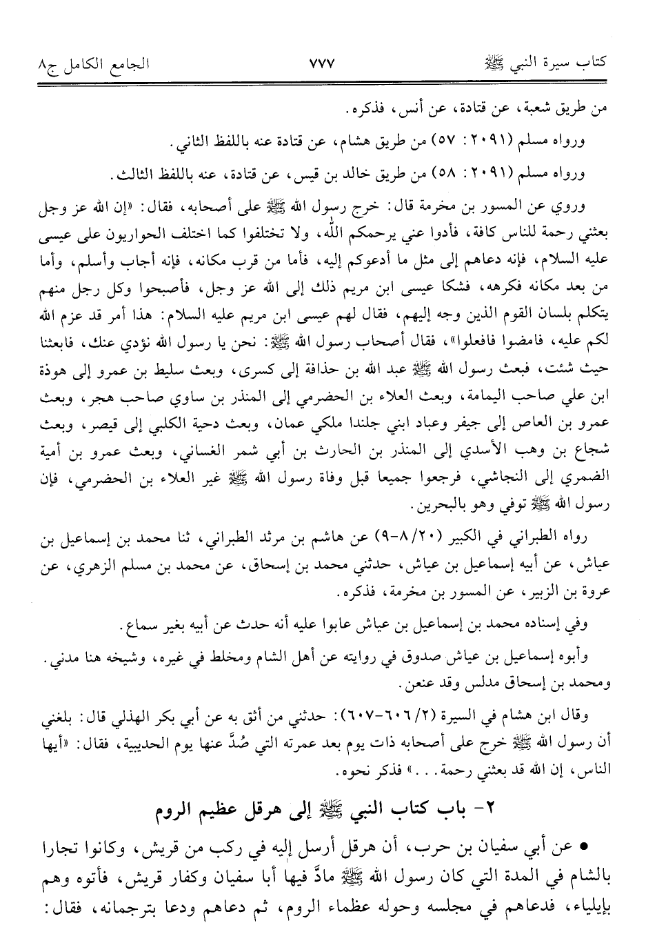 رواه الطبراني في الكبير (٢٠/ ٨ - ٩) عن هاشم بن مرثد الطبراني، ثنا محمد بن إسماعيل بن عياش، عن أبيه إسماعيل بن عياش، حدثني محمد بن إسحاق، عن محمد بن مسلم الزهري، عن عروة بن الزبير، عن المسور بن مخرمة، فذكره.
