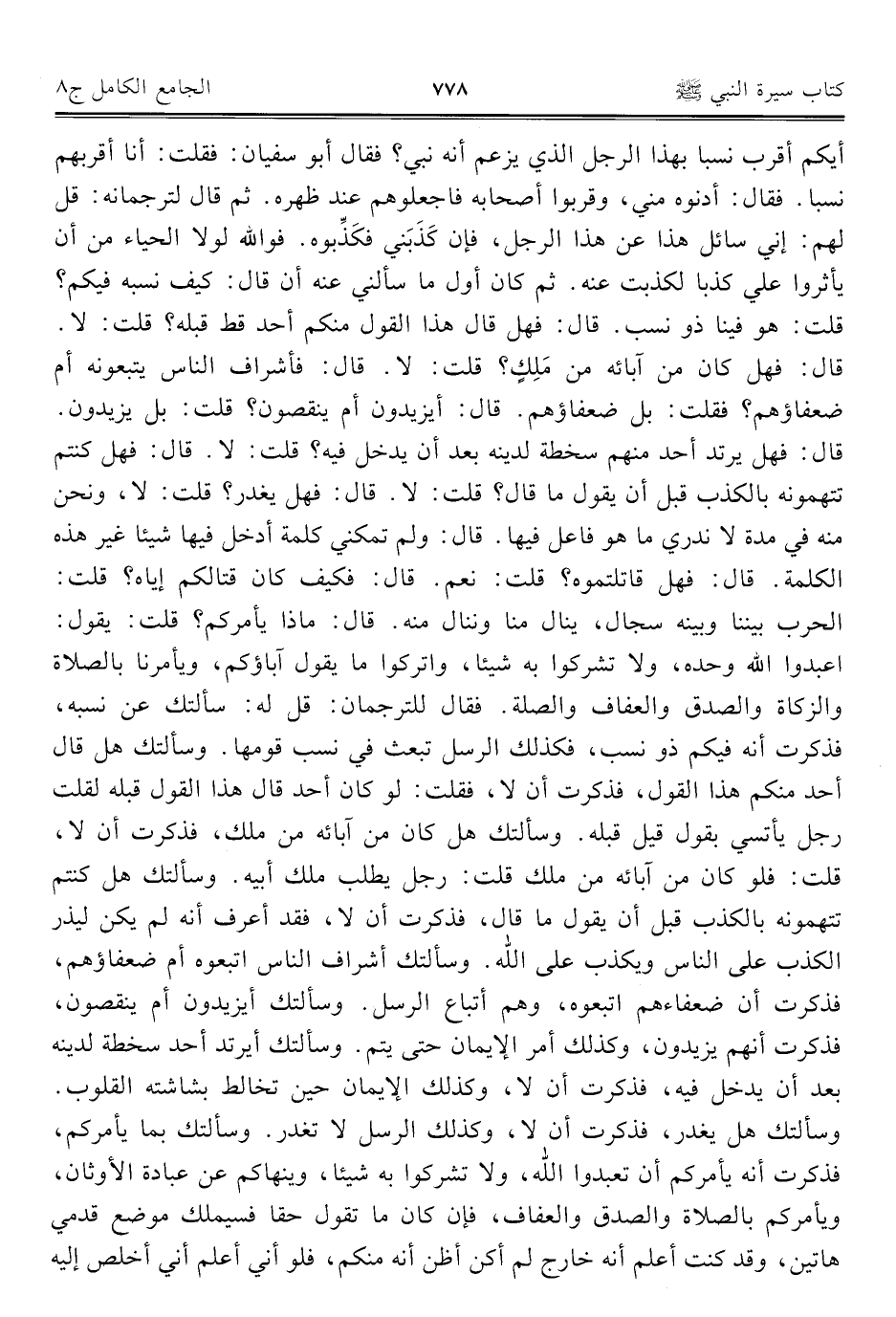 أيكم أقرب نسبا بهذا الرجل الذي يزعم أنه نبي؟ فقال أبو سفيان: فقلت: أنا أقربهم نسبا. فقال: أدنوه مني، وقربوا أصحابه فاجعلوهم عند ظهره. ثم قال لترجمانه: قل لهم: إني سائل هذا عن هذا الرجل، فإن كَذَبَني فكَذِّبوه. فوالله لولا الحياء من أن يأثروا علي كذبا لكذبت عنه. ثم كان أول ما سألني عنه أن قال: كيف نسبه فيكم؟ قلت: هو فينا ذو نسب. قال: فهل قال هذا القول منكم أحد قط قبله؟ قلت: لا. قال: فهل كان من آبائه من مَلِكٍ؟ قلت: لا. قال: فأشراف الناس يتبعونه أم ضعفاؤهم؟ فقلت: بل ضعفاؤهم. قال: أيزيدون أم ينقصون؟ قلت: بل يزيدون. قال: فهل يرتد أحد منهم سخطة لدينه بعد أن يدخل فيه؟ قلت: لا. قال: فهل كنتم تتهمونه بالكذب قبل أن يقول ما قال؟ قلت: لا. قال: فهل يغدر؟ قلت: لا، ونحن منه في مدة لا ندري ما هو فاعل فيها. قال: ولم تمكني كلمة أدخل فيها شيئا غير هذه الكلمة. قال: فهل قاتلتموه؟ قلت: نعم. قال: فكيف كان قتالكم إياه؟ قلت: الحرب بيننا وبينه سجال، ينال منا وننال منه. قال: ماذا يأمركم؟ قلت: يقول: اعبدوا الله وحده، ولا تشركوا به شيئا، واتركوا ما يقول آباؤكم، ويأمرنا بالصلاة والزكاة والصدق والعفاف والصلة. فقال للترجمان: قل له: سألتك عن نسبه، فذكرت أنه فيكم ذو نسب، فكذلك الرسل تبعث في نسب قومها. وسألتك هل قال أحد منكم هذا القول، فذكرت أن لا، فقلت: لو كان أحد قال هذا القول قبله لقلت رجل يأتسي بقول قيل قبله. وسألتك هل كان من آبائه من ملك، فذكرت أن لا، قلت: فلو كان من آبائه من ملك قلت: رجل يطلب ملك أبيه. وسألتك هل كنتم تتهمونه بالكذب قبل أن يقول ما قال، فذكرت أن لا، فقد أعرف أنه لم يكن ليذر الكذب على الناس ويكذب على الله. وسألتك أشراف الناس اتبعوه أم ضعفاؤهم، فذكرت أن ضعفاءهم اتبعوه، وهم أتباع الرسل. وسألتك أيزيدون أم ينقصون، فذكرت أنهم يزيدون، وكذلك أمر الإيمان حتى يتم. وسألتك أيرتد أحد سخطة لدينه بعد أن يدخل فيه، فذكرت أن لا، وكذلك الإيمان حين تخالط بشاشته القلوب. وسألتك هل يغدر، فذكرت أن لا، وكذلك الرسل لا تغدر. وسألتك بما يأمركم، فذكرت أنه يأمركم أن تعبدوا الله، ولا تشركوا به شيئا، وينهاكم عن عبادة الأوثان، ويأمركم بالصلاة والصدق والعفاف، فإن كان ما تقول حقا فسيملك موضع قدمي هاتين، وقد كنت أعلم أنه خارج لم أكن أظن أنه منكم، فلو أني أعلم أني أخلص إليه