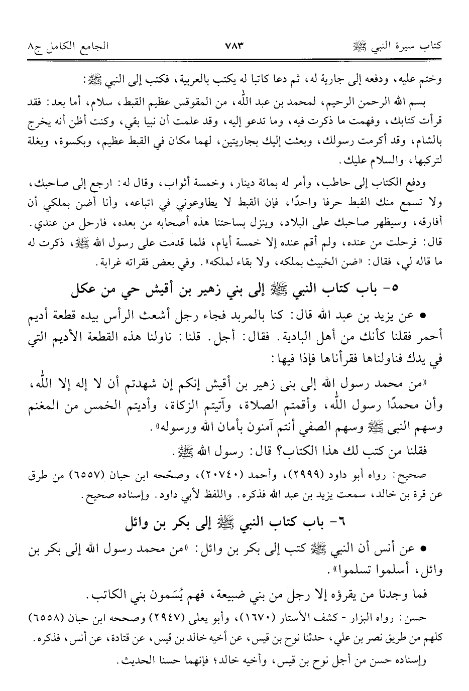 • عن أنس أن النبي - صلى الله عليه وسلم - كتب إلى بكر بن وائل: "من محمد رسول الله إلى بكر بن وائل، أسلموا تسلموا".