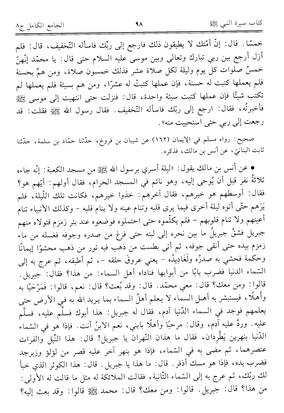 خمسًا. قال: إنّ أمّتك لا يطيقون ذلك فارجع إلى ربِّك فاسأله التّخفيف، قال: فلم أزل أرجع بين ربي تبارك وتعالى وبين موسى عليه السلام حتى قال: يا محمّد إنّهنّ خمسُ صلوات كل يوم وليلة لكل صلاة عشر فذلك خمسون صلاة، ومن همَّ بحسنة فلم يعملها كتبت له حسنة، فإن عملها كتبتْ له عشرًا، ومن هم بسيئة فلم يعملها لم تكتب شيئًا فإن عملها كتبت سيئة واحدة، قال: فنزلت حتى انتهيت إلى موسى - صلى الله عليه وسلم - فأخبرتُه، فقال: ارجع إلى ربّك فاسأله التّخفيف. فقال رسول الله - صلى الله عليه وسلم - فقلت: قد رجعت إلى ربي حتى استحييت منه".