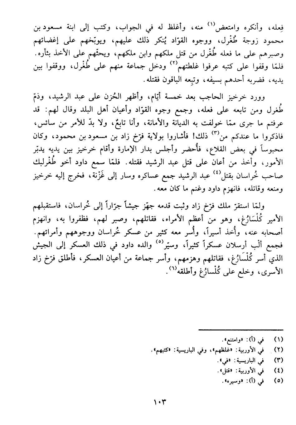 وَوَرَدَ خِرْخِيزُ الْحَاجِبُ بَعْدَ خَمْسَةِ أَيَّامٍ، وَأَظْهَرَ الْحُزْنَ عَلَى عَبْدِ الرَّشِيدِ، وَذَمَّ طُغْرُلَ وَمَنْ تَابَعَهُ عَلَى فِعْلِهِ، وَجَمَعَ وَجُوهَ الْقُوَّادِ وَأَعْيَانَ أَهْلِ الْبَلَدِ وَقَالَ لَهُم ْ: قَدْ عَرَفْتُمْ مَا جَى مِمَّا خُولِفَتْ بِهِ الدِّيَانَةُ وَالْأَمَانَةُ، وَأَنَا تَابِعٌ، وَلَا بُدَّ لِلْأَمْرِ مِنْ سَائِسٍ، فَاذْكُرُوا مَا عِنْدَكُمْ مِنْ ذَلِك َ. فَأَشَارُوا بِوِلَايَةِ فَرَّخْ زَادَ بْنِ مَسْعُودِ بْنِ مَحْمُودٍ وَكَانَ مَحْبُوسًا فِي بَعْضِ الْقلَاعِ، فَأُحْضِرَ وَأُجْلِسَ بِدَارِ الْإِمَارَةِ، وَأَقَامَ خِرْخِيزُ بَيْنَ يَدَيْهِ يُدَبِّرُ الْأُمُورَ، وَأَخَذَ مَنْ أَعَانَ عَلَى قَتْلِ عَبْدِ الرَّشِيدِ فَقَتَلَهُ، فَلَمَّا سَمِعَ دَاوُدُ أَخُو طُغْرُلْبَك صَاحِبُ خُرَاسَانَ بِقَتْلِ عَبْدِ الرَّشِيدِ جَمَعَ عَسَاكِرَهُ وَسَارَ إِلَى غَزْنَةَ، فَخَرَجَ إِلَيْهِ خِرْخِيزُ وَمَنَعَهُ وَقَاتَلَهُ، فَانْهَزَمَ دَاوُدُ وَغَنِمَ مَا كَانَ مَعَه ُ.