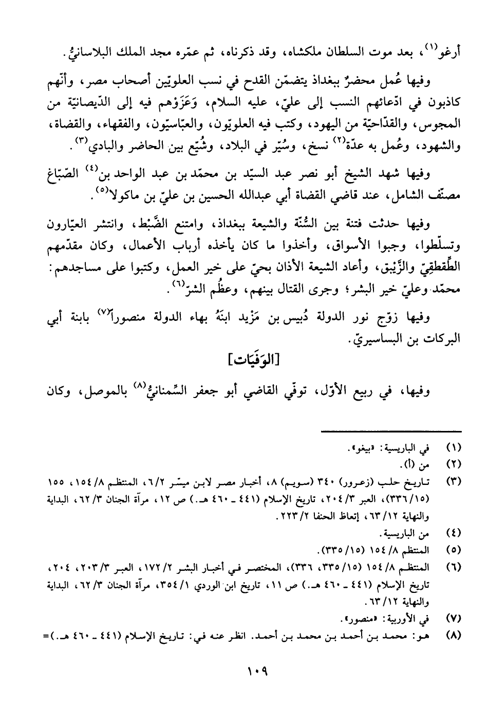وَفِيهَا حَدَثَتْ فِتْنَةٌ بَيْنَ السُّنَّةِ وَالشِّيعَةِ بِبَغْدَاذَ، وَامْتَنَعَ الضَّبْطُ، وَانْتَشَرَ الْعَيَّارُونَ وَتَسَلَّطُوا، وَجَبَوُا الْأَسْوَاقَ، وَأَخَذُوا مَا كَانَ يَأْخُذُهُ أَرْبَابُ الْأَعْمَالِ، وَكَانَ مُقَدَّمَهُمُ الطِّقْطِقِيُّ وَالزَّيْبَقُ، وَأَعَادَ الشِّيعَةُ الْأَذَانَ بِحَيِّ عَلَى خَيْرِ الْعَمَلِ، وَكَتَبُوا عَلَى مَسَاجِدِهِم ْ: مُحَمَّدٌ وَعَلِيٌّ خَيْرُ الْبَشَرِ، وَجَرَى الْقِتَالُ بَيْنَهُمْ وَعَظُمَ الشَّر ُّ. وَفِيهَا زَوَّجَ نُورُ الدَّوْلَةِ دُبَيْسُ بْنُ مَزْيَدٍ ابْنَهُ بَهَاءَ الدَّوْلَةِ مَنْصُورًا بِابْنَةِ أَبِي الْبَرَكَاتِ بْنِ الْبَسَاسِيرِيِّ.