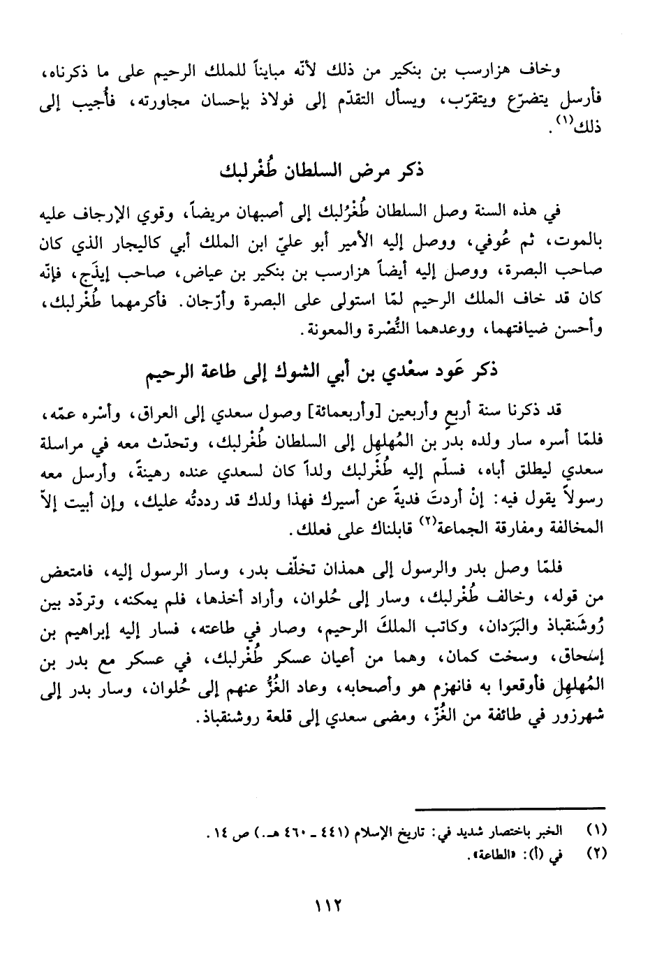 قَدْ ذَكَرْنَا سَنَةَ أَرْبَعٍ وَأَرْبَعِينَ [وَأَرْبَعِمِائَةٍ] وُصُولَ سَعْدِي إِلَى الْعِرَاقِ، وَأَسْرِهِ عَمَّهُ، فَلَمَّا أَسَرَهُ سَارَ وَلَدُهُ بَدْرُ بْنُ الْمُهَلْهِلِ إِلَى السُّلْطَانِ طُغْرُلْبَك، وَتَحَدَّثَ مَعَهُ فِي مُرَاسَلَةِ سَعْدِي لِيُطْلِقَ أَبَاهُ، فَسَلَّمَ إِلَيْهِ طُغْرُلْبَك وَلَدًا كَانَ لِسَعْدِي عِنْدَهُ رَهِينَةً، وَأَرْسَلَ مَعَهُ رَسُولًا يَقُولُ فِيه ِ: إِنْ أَرَدْتَ فِدْيَةً عَنْ أَسِيرِكَ فَهَذَا وَلَدُكَ قَدْ رَدَدْتُهُ عَلَيْكَ، وَإِنْ أَبَيْتَ إِلَّا الْمَالَفَةَ وَمُفَارَقَةَ الْجَمَاعَةِ قَابَلْنَاكَ عَلَى فِعْلِك َ.