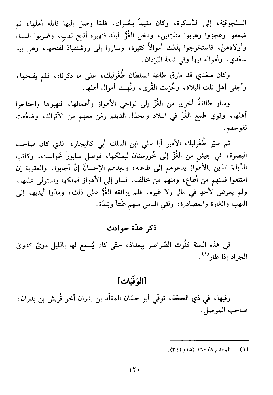 السَّلْجُوقِيَّةِ، إِلَى الدَّسْكَرَةِ، وَكَانَ مُقِيمًا بِحُلْوَانَ، فَلَمَّا وَصَلَ إِلَيْهَا قَاتَلَهُ أَهْلُهَا ثُمَّ ضَعُفُوا وَعَجَزُوا وَهَرَبُوا مُتَفَرِّقِينَ، وَدَخَلَ الْغُزُّ الْبَلَدَ فَنَهَبُوهُ أَقْبَحَ نَهْبٍ، وَضَرَبُوا النِّسَاءَ وَأَوْلَادَهُنَّ، فَاسْتَخْرَجُوا بِذَلِكَ أَمْوَالًا كَثِيرَةً، وَسَارُوا إِلَى رُوشَنْقِبَاذَ لِفَتْحِهَا، وَهِيَ بِيَدِ سَعْدِي، وَأَمْوَالُهُ فِيهَا وَفِي قَلْعَةِ الْبَرَدَانِ.