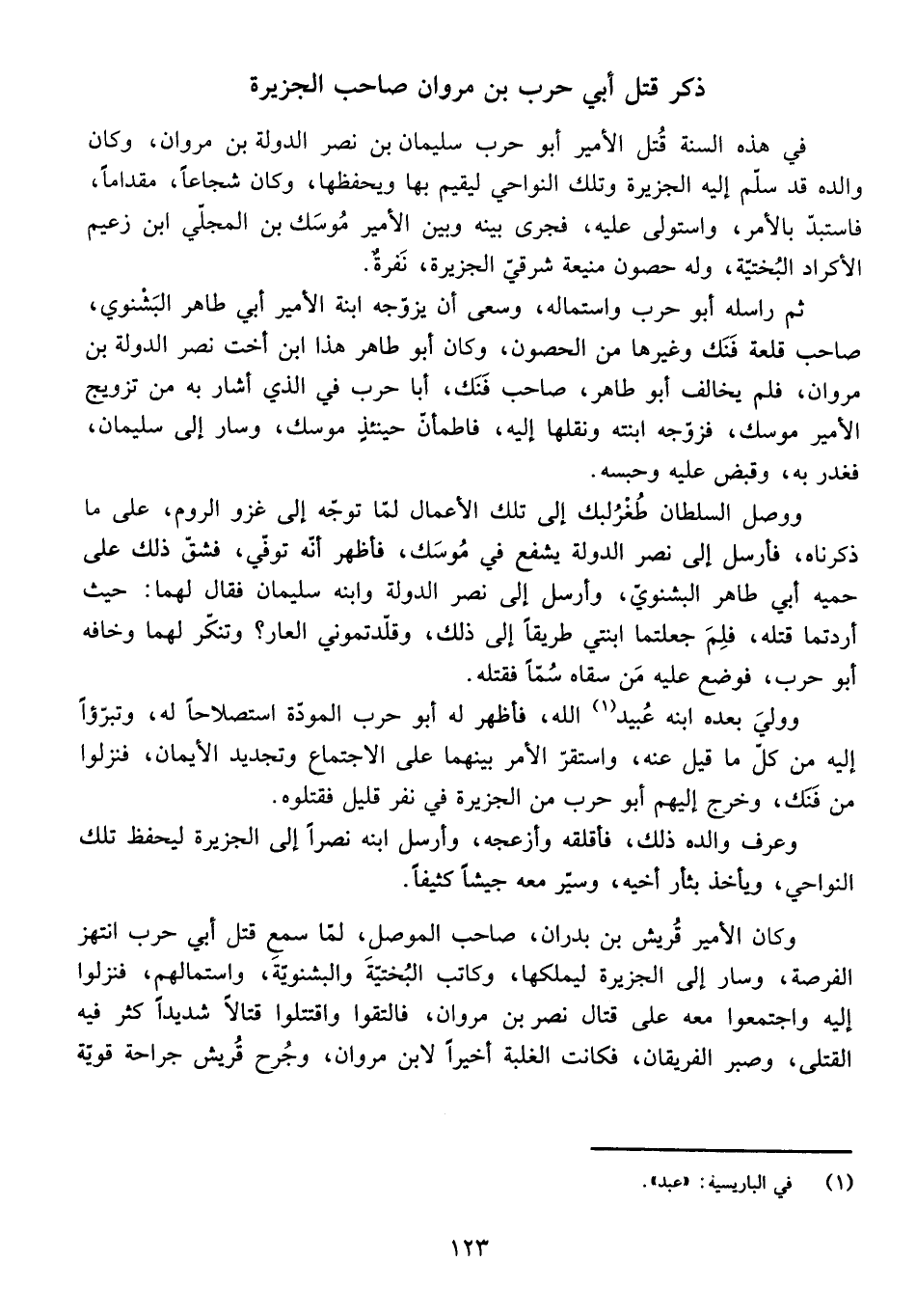 فِي هَذِهِ السَّنَةِ قُتِلَ الْأَمِيرُ أَبُو حَرْبٍ سُلَيْمَانُ بْنُ نَصْرِ الدَّوْلَةِ بْنِ مَرْوَانَ، وَكَانَ وَالِدُهُ قَدْ سَلَّمَ إِلَيْهِ الْجَزِيرَةَ وَتِلْكَ النَّوَاحِيَ لِيُقِيمَ بِهَا وَيَحْفَظَهَا، وَكَانَ شُجَاعًا مِقْدَامًا، فَاسْتَبَدَّ بِالْأَمْرِ وَاسْتَوْلَى عَلَيْهِ، فَجَرَى بَيْنَهُ وَبَيْنَ الْأَمِيرِ مُوسَكَ بْنِ الْمُجَلِّي ابْنِ زَعِيمِ الْأَكْرَادِ الْبُخْتِيَّةِ، وَلَهُ حُصُونٌ مَنِيعَةٌ شَرْقِيَّ الْجَزِيرَةِ - نَفْرَةٌ.