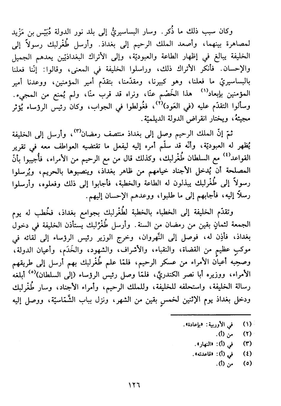 وَكَانَ سَبَبُ ذَلِكَ مَا ذُكِرَ. وَسَارَ الْبَسَاسِيرِيُّ إِلَى بَلَدِ نُورِ الدَّوْلَةِ دُبَيْسِ بْنِ مَزْيَدٍ لِمُصَاهَرَةٍ بَيْنَهُمَا، وَأَصْعَدَ الْمَلِكَ الرَّحِيمَ إِلَى بَغْدَاذَ. وَأَرْسَلَ طُغْرُلْبَك رَسُولًا إِلَى الْخَلِيفَةِ يُبَالِغُ فِي إِظْهَارِ الطَّاعَةِ وَالْعُبُودِيَّةِ، وَإِلَى الْأَتْرَاكِ الْبَغْدَاذِيِّينَ يَعِدُهُمُ الْجَمِيلَ وَالْإِحْسَانَ، فَأَنْكَرَ الْأَتْرَاكُ ذَلِكَ، وَرَاسَلُوا الْخَلِيفَةَ فِي الْمَعْنَى، وَقَالُوا: إِنَّنَا فَعَلْنَا بِالْبَسَاسِيرِيِّ مَا فَعَلْنَا، وَهُوَ كَبِيرُنَا، وَمُقَدَّمُنَا، بِتَقَدُّمِ أَمِيرِ الْمُؤْمِنِينَ، وَوَعَدَنَا أَمِيرُ الْمُؤْمِنِينَ بِإِبْعَادِ هَذَا الْخَصْمِ عَنَّا، وَنَرَاهُ قَدْ قَرُبَ مِنَّا، وَلَمْ يُمْنَعْ مِنَ الْمَجِيءِ. وَسَأَلُوا التَّقَدُّمَ عَلَيْهِ (فِي الْعَوْدِ) ، فَغُولِطُوا فِي الْجَوَابِ، وَكَانَ رَئِيسُ الرُّؤَسَاءِ يُؤْثِرُ مَجِيئَهُ، وَيَخْتَارُ انْقِرَاضَ الدَّوْلَةِ الدَّيْلَمِيَّةِ.