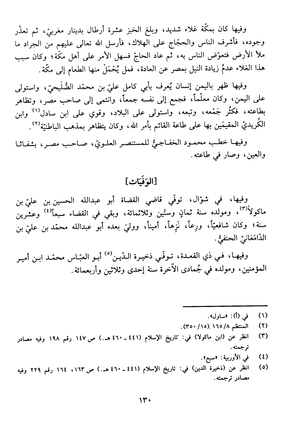 وَفِيهَا فِي شَوَّالٍ تُوُفِّيَ قَاضِي الْقُضَاةِ أَبُو عَبْدِ اللَّهِ الْحُسَيْنُ بْنُ عَلِيِّ بْنِ مَاكُولَا، وَمَوْلِدُهُ سَنَةَ ثَمَانٍ وَسِتِّينَ وَثَلَاثِمِائَةٍ، وَبَقِيَ فِي الْقَضَاءِ سَبْعًا وَعِشْرِينَ سَنَةً، وَكَانَ شَافِعِيًّا، وَرِعًا، نَزِهًا، أَمِينًا، وَوَلِيَ بَعْدَهُ أَبُو عَبْدِ اللَّهِ مُحَمَّدُ بْنُ عَلِيِّ بْنِ الدَّامَغَانِيِّ الْحَنَفِيُّ.