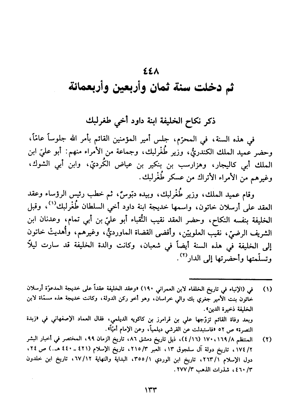 وَقَامَ عَمِيدُ الْمُلْكِ، وَزِيرُ طُغْرُلْبَك، وَبِيَدِهِ دَبُّوسٌ، ثُمَّ خَطَبَ رَئِيسُ الرُّؤَسَاءِ، وَعَقَدَ الْعَقْدَ عَلَى أَرْسِلَانَ خَاتُونَ، وَاسْمُهَا خَدِيجَةُ ابْنَةُ دَاوُدَ أَخِي السُّلْطَانِ طُغْرُلْبَك، وَقَبِلَ الْخَلِيفَةُ بِنَفْسِهِ النِّكَاحَ، وَحَضَرَ الْعَقْدَ نَقِيبُ النُّقَبَاءِ أَبُو عَلِيِّ بْنُ أَبِي تَمَّامٍ، وَعَدْنَانُ بْنُ الشَّرِيفِ الرَّضِيِّ، نَقِيبُ الْعَلَوِيِّينَ، وَأَقْضَى الْقُضَاةِ الْمَاوَرْدِيُّ، وَغَيْرُهُمْ، وَأُهْدِيَتْ خَاتُونُ إِلَى الْخَلِيفَةِ فِي هَذِهِ السَّنَةِ أَيْضًا فِي شَعْبَانَ، وَكَانَتْ وَالِدَةُ الْخَلِيفَةِ قَدْ سَارَتْ لَيْلًا وَتَسَلَّمَتْهَا وَأَحْضَرَتْهَا إِلَى الدَّارِ.