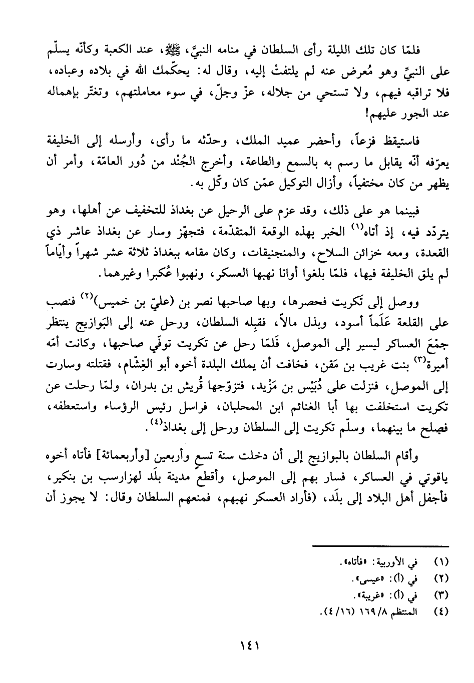 فَلَمَّا كَانَ تِلْكَ اللَّيْلَةُ رَأَى السُّلْطَانُ فِي مَنَامِهِ النَّبِيَّ - صَلَّى اللَّهُ عَلَيْهِ وَسَلَّمَ - عِنْدَ الْكَعْبَةِ وَكَأَنَّهُ يُسَلِّمُ عَلَى النَّبِيِّ وَهُوَ مُعْرِضٌ عَنْهُ لَمْ يَلْتَفِتْ إِلَيْهِ، وَقَالَ لَهُ: يُحَكِّمُكَ اللَّهُ فِي بِلَادِهِ وَعِبَادِهِ، فَلَا تُرَاقِبُهُ فِيهِمْ، وَلَا تَسْتَحْيِي مِنْ جَلَالِهِ - عَزَّ وَجَلَّ - فِي سُوءِ مُعَامَلَتِهِمْ، وَتَغْتَرَّ بِإِهْمَالِهِ عِنْدَ الْجَوْرِ عَلَيْهِمْ!