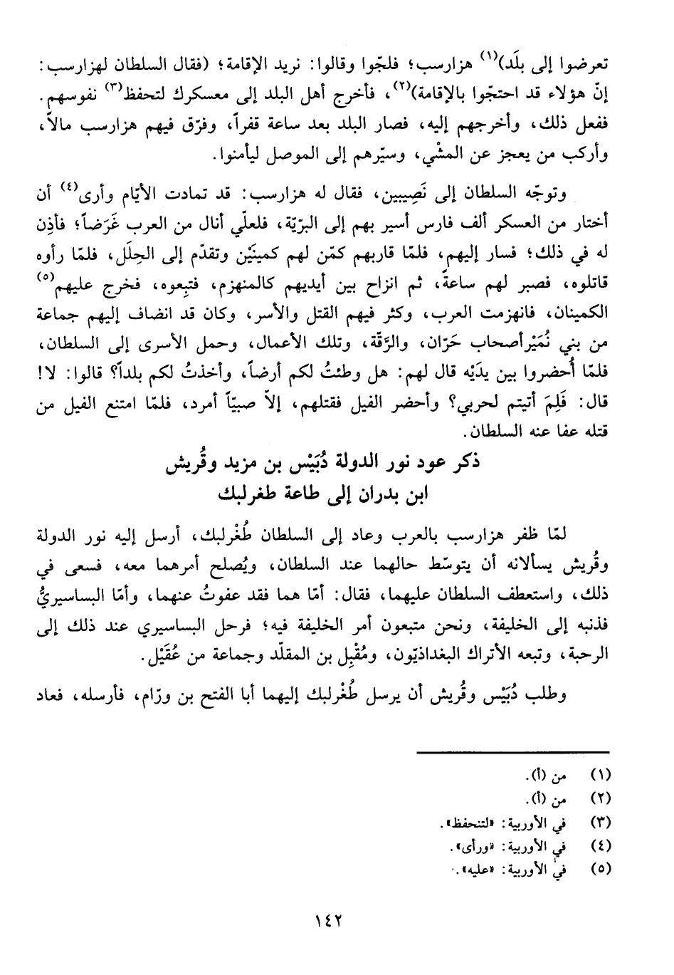 وَتَوَجَّهَ السُّلْطَانُ إِلَى نَصِيبِينَ، فَقَالَ لَهُ هَزَارَسْبُ: قَدْ تَمَادَتِ الْأَيَّامُ، وَأَرَى أَنْ أَخْتَارَ مِنَ الْعَسْكَرِ أَلْفَ فَارِسٍ أَسِيرُ بِهِمْ إِلَى الْبَرِّيَّةِ، فَلَعَلِّي أَنَالُ مِنَ الْعَرَبِ غَرَضًا، فَأَذِنَ لَهُ فِي ذَلِكَ، فَسَارَ إِلَيْهِمْ، فَلَمَّا قَارَبَهُمْ كَمَّنَ لَهُمْ كَمِينَيْنِ، وَتَقَدَّمَ إِلَى الْحِلَلِ، فَلَمَّا رَأَوْهُ قَاتَلُوهُ، فَصَبَرَ لَهُمْ سَاعَةً، ثُمَّ انْزَاحَ بَيْنَ أَيْدِيهِمْ كَالْمُنْهَزِمِ، فَتَبِعُوهُ، فَخَرَجَ عَلَيْهِمُ الْكَمِينَانِ، فَانْهَزَمَتِ الْعَرَبُ، وَكَثُرَ فِيهِمُ الْقَتْلُ وَالْأَسْرُ، وَكَانَ قَدِ انْضَافَ إِلَيْهِمْ جَمَاعَةٌ مِنْ بَنِي نُمَيْرٍ أَصْحَابِ حَرَّانَ وَالرَّقَّةِ وَتِلْكَ الْأَعْمَالِ، وَحَمَلَ الْأَسْرَى إِلَى السُّلْطَانِ، فَلَمَّا أُحْضِرُوا بَيْنَ يَدَيْهِ قَالَ لَهُمْ: هَلْ وَطِئْتُ لَكُمْ أَرْضًا، وَأَخَذْتُ لَكُمْ بَلَدًا. قَالُوا: لَا! قَالَ: فَلِمَ أَتَيْتُمْ لِحَرْبِي؟ وَأَحْضَرَ الْفِيلَ فَقَتَلَهُمْ، إِلَّا صَبِيًّا أَمْرَدَ، فَلَمَّا امْتَنَعَ الْفِيلُ مِنْ قَتْلِهِ عَفَا عَنْهُ السُّلْطَانُ.