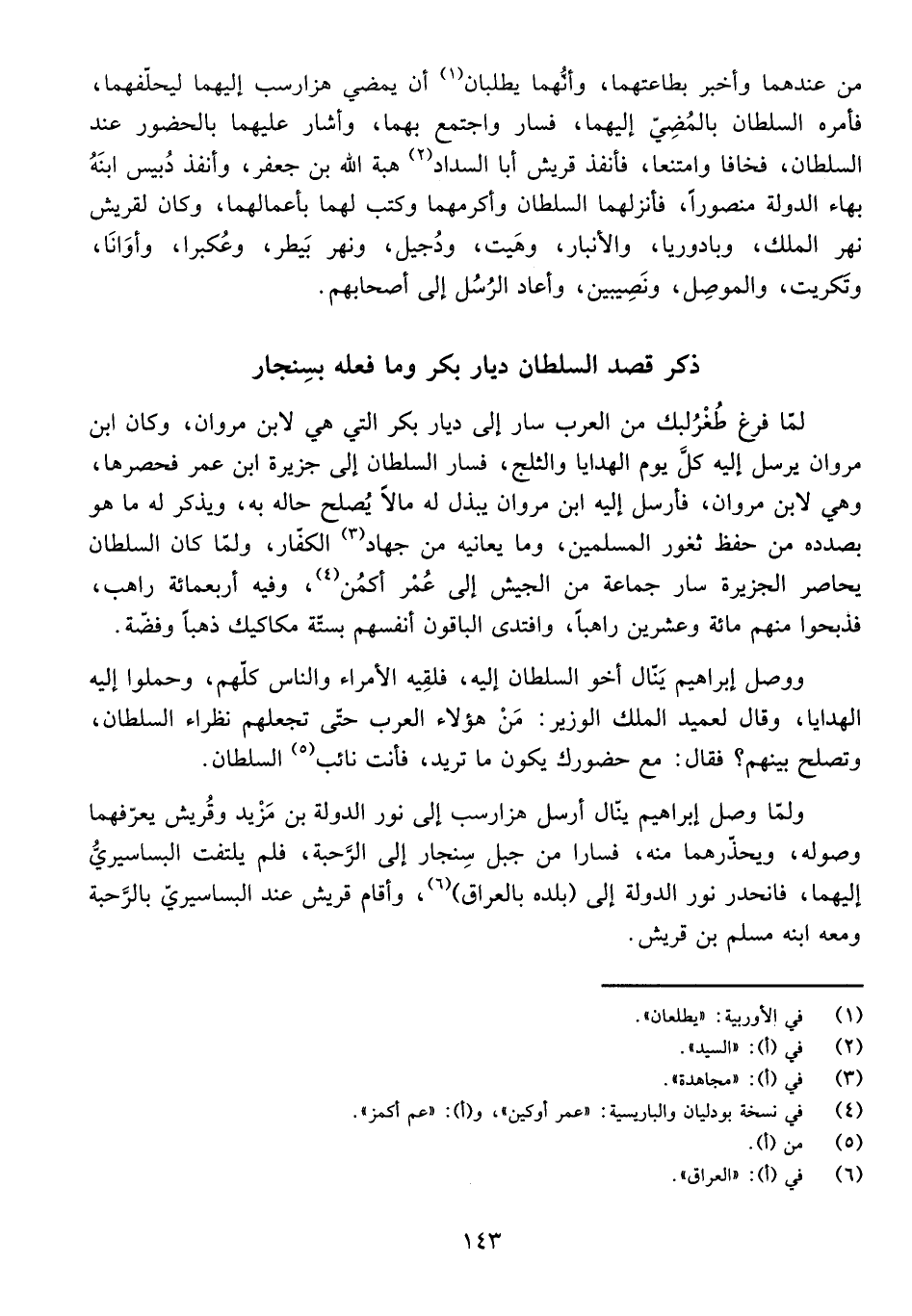 مِنْ عِنْدِهِمَا، وَأَخْبَرَ بِطَاعَتِهِمَا، وَأَنَّهُمَا يَطْلُبَانِ أَنْ يَمْضِيَ هَزَارَسْبُ إِلَيْهِمَا لِيُحَلِّفَهُمَا. فَأَمَرَهُ السُّلْطَانُ بِالْمُضِيِّ إِلَيْهِمَا، فَسَارَ وَاجْتَمَعَ بِهِمَا، وَأَشَارَ عَلَيْهِمَا بِالْحُضُورِ عِنْدَ السُّلْطَانِ، فَخَافَا وَامْتَنَعَا، فَأَنْفَذَ قُرَيْشٌ أَبَا السَّدَادِ هِبَةَ اللَّهِ بْنَ جَعْفَرٍ. وَأَنْفَذَ دُبَيْسٌ ابْنَهُ بَهَاءَ الدَّوْلَةِ مَنْصُورًا، فَأَنْزَلَهُمَا السُّلْطَانُ وَأَكْرَمَهُمَا وَكَتَبَ لَهُمَا بِأَعْمَالِهِمَا، وَكَانَ لِقُرَيْشٍ نَهْرُ الْمَلِكِ، وَبَادُورْيَا، وَالْأَنْبَارُ، وَهِيتُ، وَدُجَيْلٌ، وَنَهْرُ بَيْطَرَ، وَعُكْبَرَا، وَأَوَانَا، وَتَكْرِيتُ، وَالْمَوْصِلُ، وَنَصِيبِينُ، وَأَعَادَ الرُّسُلَ إِلَى أَصْحَابِهِمْ.