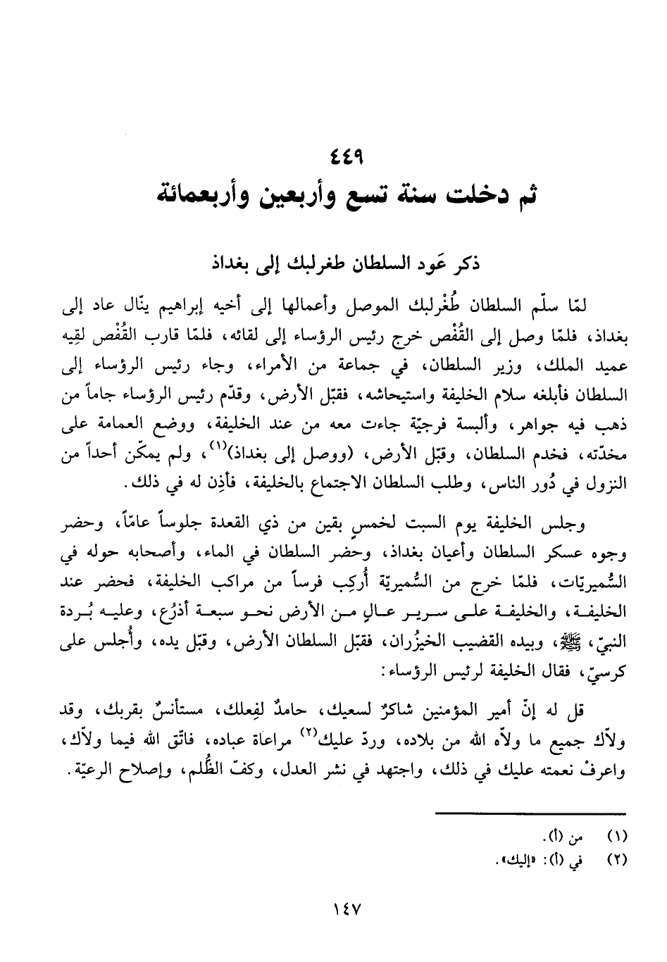 لَمَّا سَلَّمَ السُّلْطَانُ طُغْرُلْبَك الْمَوْصِلَ وَأَعْمَالَهَا إِلَى أَخِيهِ إِبْرَاهِيمَ يَنَّالَ - عَادَ إِلَى بَغْدَاذَ، فَلَمَّا وَصَلَ إِلَى الْقُفْصِ خَرَجَ رَئِيسُ الرُّؤَسَاءِ إِلَى لِقَائِهِ، فَلَمَّا قَارَبَ الْقُفْصَ لَقِيَهُ عَمِيدُ الْمُلْكِ، وَزِيرُ السُّلْطَانِ، فِي جَمَاعَةٍ مِنَ الْأُمَرَاءِ، وَجَاءَ رَئِيسُ الرُّؤَسَاءِ إِلَى السُّلْطَانِ فَأَبْلَغَهُ سَلَامَ الْخَلِيفَةِ وَاسْتِيحَاشَهُ، فَقَبَّلَ الْأَرْضَ، وَقَدَّمَ رَئِيسُ الرُّؤَسَاءِ جَامًا مِنْ ذَهَبٍ فِيهِ جَوَاهِرُ، وَأَلْبِسَةً فَرْجِيَّةً جَاءَتْ مَعَهُ مِنْ عِنْدِ الْخَلِيفَةِ، وَوَضَعَ الْعِمَامَةَ عَلَى مِخَدَّتِهِ، فَخَدَمَ السُّلْطَانَ، وَقَبَّلَ الْأَرْضَ، (وَوَصَلَ إِلَى بَغْدَاذَ) وَلَمْ يُمَكِّنْ أَحَدًا مِنَ النُّزُولِ فِي دُورِ النَّاسِ، وَطَلَبَ السُّلْطَانُ الِاجْتِمَاعَ بِالْخَلِيفَةِ، فَأُذِنَ لَهُ فِي ذَلِكَ.