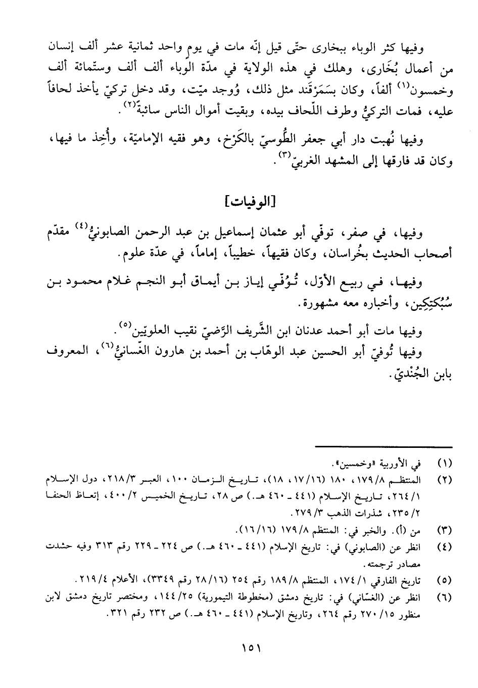 وَفِيهَا كَثُرَ الْوَبَاءُ بِبُخَارَى حَتَّى قِيلَ: إِنَّهُ مَاتَ فِي يَوْمٍ وَاحِدٍ ثَمَانِيَةَ عَشَرَ أَلْفَ إِنْسَانٍ مِنْ أَعْمَالِ بُخَارَى، وَهَلَكَ فِي هَذِهِ الْوِلَايَةِ فِي مُدَّةِ الْوَبَاءِ أَلْفُ أَلْفٍ وَسِتُّمِائَةِ أَلْفٍ وَخَمْسُونَ أَلْفًا، وَكَانَ بِسَمَرْقَنْدَ مِثْلُ ذَلِكَ، وَوُجِدَ مَيِّتٌ، وَقَدْ دَخَلَ تُرْكِيٌّ يَأْخُذُ لِحَافًا عَلَيْهِ، فَمَاتَ التُّرْكِيُّ وَطَرْفُ اللِّحَافِ بِيَدِهِ، وَبَقِيَتْ أَمْوَالُ النَّاسِ سَائِبَةً.
