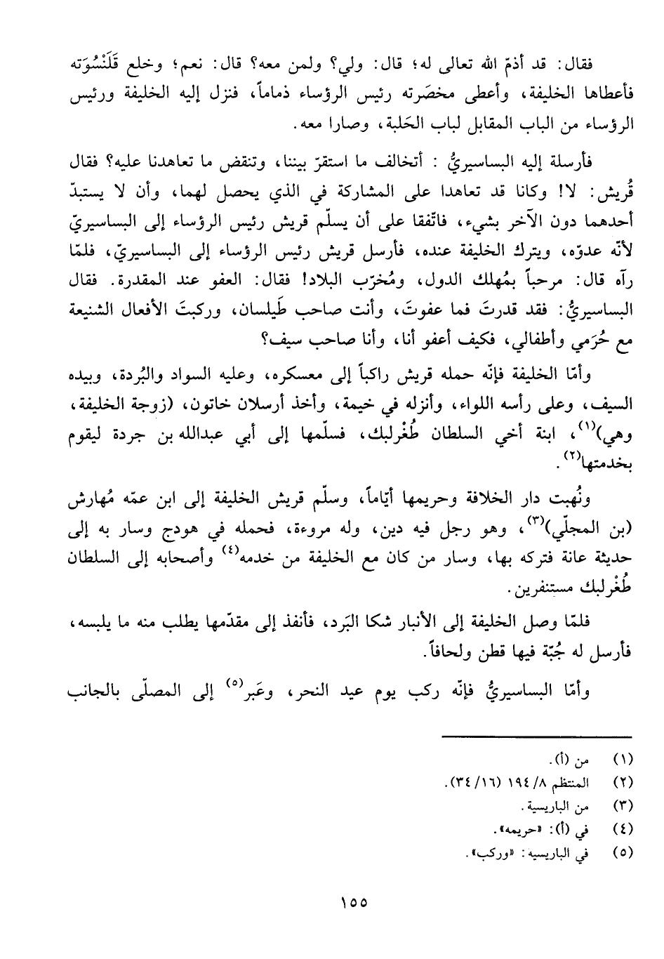 فَأَرْسَلَ إِلَيْهِ الْبَسَاسِيرِيُّ: أَتُخَالِفُ مَا اسْتَقَرَّ بَيْنَنَا، وَتَنْقُضُ مَا تَعَاهَدْنَا عَلَيْهِ؟ فَقَالَ قُرَيْشٌ: لَا. وَكَانَا قَدْ تَعَاهَدَا عَلَى الْمُشَارَكَةِ فِي الَّذِي يَحْصُلُ لَهُمَا، وَأَنْ لَا يَسْتَبِدَّ أَحَدُهُمَا دُونَ الْآخَرِ بِشَيْءٍ، فَاتَّفَقَا عَلَى أَنْ يُسَلِّمَ قُرَيْشٌ رَئِيسَ الرُّؤَسَاءِ إِلَى الْبَسَاسِيرِيِّ ; لِأَنَّهُ عَدُوُّهُ، وَيَتْرُكَ الْخَلِيفَةَ عِنْدَهُ، فَأَرْسَلَ قُرَيْشٌ رَئِيسَ الرُّؤَسَاءِ إِلَى الْبَسَاسِيرِيِّ، فَلَمَّا رَآهُ قَالَ: مَرْحَبًا بِمُهْلِكِ الدُّوَلِ، وَمُخَرِّبِ الْبِلَادِ! فَقَالَ: الْعَفْوَ عِنْدَ الْمَقْدِرَةِ. فَقَالَ الْبَسَاسِيرِيُّ: فَقَدْ قَدَرْتَ فَمَا عَفَوْتَ، وَأَنْتَ صَاحِبُ طَيْلَسَانَ، وَرَكِبْتَ الْأَفْعَالَ الشَّنِيعَةَ مَعَ حُرَمِي وَأَطْفَالِي، فَكَيْفَ أَعْفُو أَنَا، وَأَنَا صَاحِبُ السَّيْفِ؟