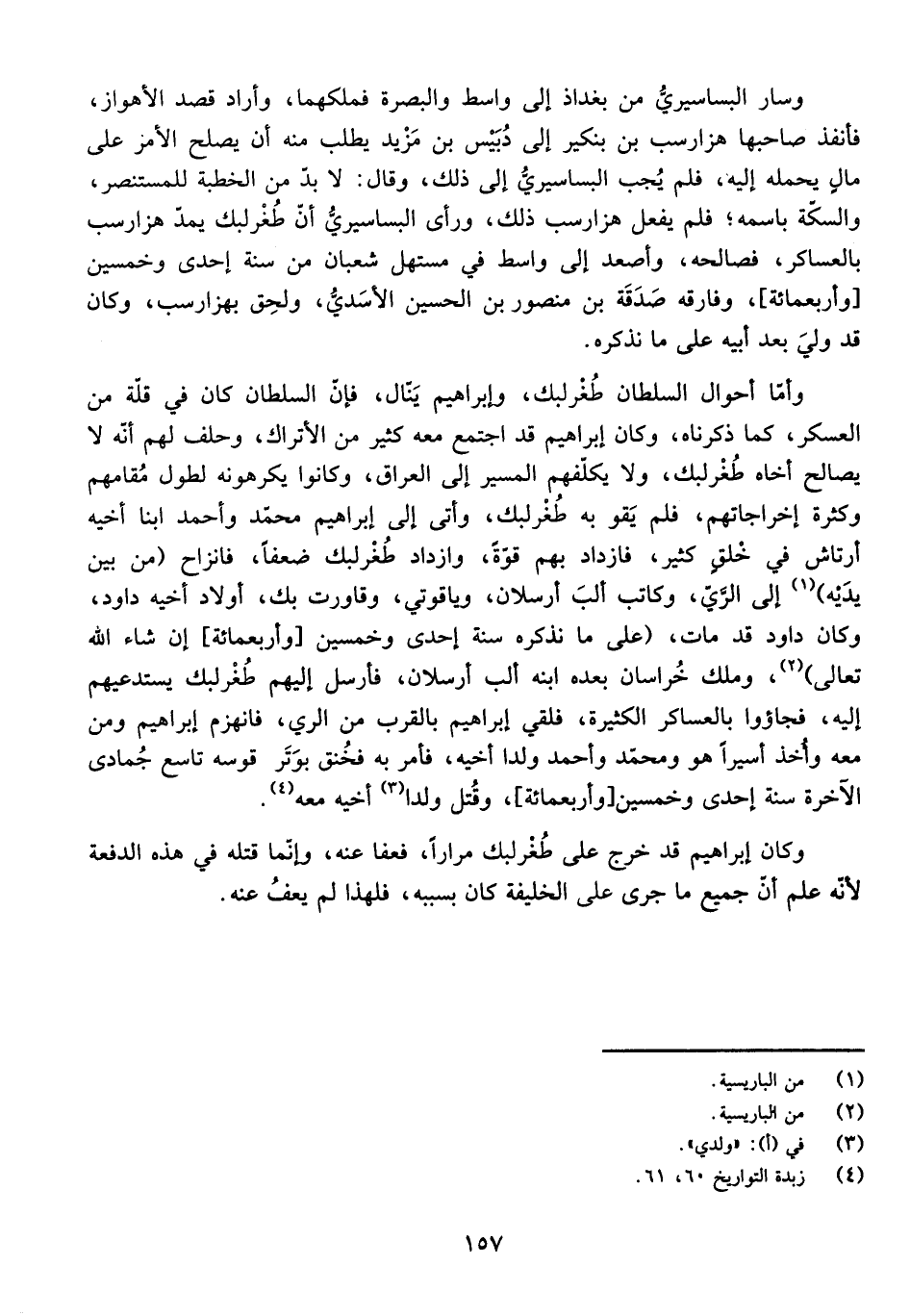 وَأَمَّا أَحْوَالُ السُّلْطَانِ طُغْرُلْبَك وَإِبْرَاهِيمَ يَنَّالَ، فَإِنَّ السُّلْطَانَ كَانَ فِي قِلَّةٍ مِنَ الْعَسْكَرِ، كَمَا ذَكَرْنَاهُ، وَكَانَ إِبْرَاهِيمُ قَدِ اجْتَمَعَ مَعَهُ كَثِيرٌ مِنَ الْأَتْرَاكِ، وَحَلَفَ لَهُمْ أَنَّهُ لَا يُصَالِحُ أَخَاهُ طُغْرُلْبَك، وَلَا يُكَلِّفُهُمُ الْمَسِيرَ إِلَى الْعِرَاقِ، وَكَانُوا يَكْرَهُونَهُ لِطُولِ مُقَامِهِمْ، وَكَثْرَةِ إِخْرَاجَاتِهِمْ، فَلَمْ يَقْوَ بِهِ طُغْرُلْبَك، وَأَتَى إِلَى إِبْرَاهِيمَ مُحَمَّدٌ وَأَحْمَدُ ابْنَا أَخِيهِ أَرْتَاشَ فِي خَلْقٍ كَثِيرٍ، فَازْدَادَ بِهِمْ قُوَّةً، وَازْدَادَ طُغْرُلْبَك ضَعْفًا، فَانْزَاحَ (مِنْ بَيْنِ يَدَيْهِ) إِلَى الرَّيِّ، وَكَاتَبَ أَلْبَ أَرْسِلَانَ، وَيَاقُوتِيَّ، وَقَاوَرْتَ بِكْ، أَوْلَادَ أَخِيهِ دَاوُدَ، وَكَانَ دَاوُدُ قَدْ مَاتَ، (عَلَى مَا نَذْكُرُهُ سَنَةَ إِحْدَى وَخَمْسِينَ [وَأَرْبَعِمِائَةٍ] إِنْ شَاءَ اللَّهُ تَعَالَى، وَمَلَكَ خُرَاسَانَ بَعْدَهُ ابْنُهُ أَلْبُ أَرْسِلَانُ، فَأَرْسَلَ إِلَيْهِمْ طُغْرُلْبَك يَسْتَدْعِيهِمْ إِلَيْهِ، فَجَاءُوا بِالْعَسَاكِرِ الْكَثِيرَةِ، فَلَقِيَ إِبْرَاهِيمَ بِالْقُرْبِ مِنَ الرَّيِّ، فَانْهَزَمَ إِبْرَاهِيمُ وَمَنْ مَعَهُ، وَأُخِذَ أَسِيرًا هُوَ وَمُحَمَّدٌ وَأَحْمَدُ وَلَدَا أَخِيهِ، فَأَمَرَ بِهِ فَخُنِقَ بِوَتَرِ قَوْسِهِ تَاسِعَ جُمَادَى الْآخِرَةِ سَنَةَ إِحْدَى وَخَمْسِينَ [وَأَرْبَعِمِائَةٍ] ، وَقُتِلَ وَلَدَا أَخِيهِ مَعَهُ.