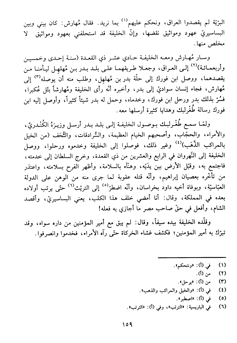 الْبَرِّيَّةِ لَمْ يَقْصِدُوا الْعِرَاقَ، وَنَحْكُمُ عَلَيْهِمْ بِمَا نُرِيدُ، فَقَالَ مُهَارِشٌ: كَانَ بَيْنِي وَبَيْنَ الْبَسَاسِيرِيِّ عُهُودٌ وَمَوَاثِيقُ نَقَضَهَا، وَإِنَّ الْخَلِيفَةَ قَدِ اسْتَحْلَفَنِي بِعُهُودٍ وَمَوَاثِيقَ لَا مَخْلَصَ مِنْهَا. وَسَارَ مُهَارِشٌ وَمَعَهُ الْخَلِيفَةُ حَادِيَ عَشَرَ ذِي الْقِعْدَةِ (سَنَةَ إِحْدَى وَخَمْسِينَ وَأَرْبَعِمِائَةٍ إِلَى الْعِرَاقِ، وَجَعَلَا طَرِيقَهُمَا عَلَى بَلَدِ بَدْرِ بْنِ مُهَلْهِلٍ لِيَأْمَنَا مَنْ يَقْصِدُهُمَا، وَوَصَلَ ابْنُ فُورَكَ إِلَى حُلَّةِ بَدْرِ بْنِ مُهَلْهِلٍ، وَطَلَبَ مِنْهُ أَنْ يُوَصِّلَهُ إِلَى مُهَارِشٍ، فَجَاءَ إِنْسَانٌ سَوَادِيٌّ إِلَى بَدْرٍ، وَأَخْبَرَهُ أَنَّهُ رَأَى الْخَلِيفَةَ وَمُهَارِشًا بِتَلِّ عُكْبُرَا، فَسُرَّ بِذَلِكَ بَدْرٌ، وَرَحَلَ ابْنُ فُورَكَ، وَخَدَمَاهُ، وَحَمَلَ لَهُ بَدْرٌ شَيْئًا كَثِيرًا، وَأَوْصَلَ إِلَيْهِ ابْنُ فُورَكَ رِسَالَةَ طُغْرُلْبِكْ، وَهَدَايَا كَثِيرَةً أَرْسَلَهَا مَعَهُ. وَلَمَّا سَمِعَ طُغْرُلْبِكْ بِوُصُولِ الْخَلِيفَةِ إِلَى بَلَدِ بِدْرٍ أَرْسَلَ وَزِيرَهُ الْكُنْدُرِيَّ، وَالْأُمَرَاءَ، وَالْحُجَّابَ، وَأَصْحَبَهُمُ الْخِيَامَ الْعَظِيمَةَ، وَالسُّرَادِقَاتِ، وَالتُّحَفَ (مِنَ الْخَيْلِ بِالْمَرَاكِبِ الذَّهَبِ وَغَيْرِ ذَلِكَ، فَوَصَلُوا إِلَى الْخَلِيفَةِ وَخَدَمُوهُ وَرَحَلُوا، وَوَصَلَ الْخَلِيفَةُ إِلَى النَّهْرَوَانِ فِي الرَّابِعِ وَالْعِشْرِينَ مِنْ ذِي الْقَعْدَةِ، وَخَرَجَ السُّلْطَانُ إِلَى خِدْمَتِهِ، فَاجْتَمَعَ بِهِ، وَقَبَّلَ الْأَرْضَ بَيْنَ يَدَيْهِ، وَهَنَّأَهُ بِالسَّلَامَةِ، وَأَظْهَرَ الْفَرَحَ بِسَلَامَتِهِ، وَاعْتَذَرَ مِنْ تَأَخُّرِهِ بِعِصْيَانِ إِبْرَاهِيمَ، وَأَنَّهُ قَتَلَهُ عُقُوبَةً لِمَا جَرَى مِنْهُ مِنَ الْوَهَنِ عَلَى الدَّوْلَةِ الْعَبَّاسِيَّةِ، وَبِوَفَاةِ أَخِيهِ دَاوُدَ بِخُرَاسَانَ، وَأَنَّهُ اضْطُرَّ إِلَى التَّرَيُّثِ حَتَّى يُرَتِّبَ أَوْلَادَهُ بَعْدَهُ فِي الْمَمْلَكَةِ، وَقَالَ: أَنَا أَمْضِي خَلْفَ هَذَا الْكَلْبِ، يَعْنِي الْبَسَاسِيرِيَّ، وَأَقْصِدُ الشَّامَ، وَأَفْعَلُ فِي حَقِّ صَاحِبِ مِصْرَ مَا أُجَازِي بِهِ فِعْلَهُ! وَقَلَّدَهُ الْخَلِيفَةُ بِيَدِهِ سَيْفًا، وَقَالَ: لَمْ يَبْقَ مَعَ أَمِيرِ الْمُؤْمِنِينَ فِي دَارِهِ سِوَاهُ، وَقَدْ تَبَرَّكَ بِهِ أَمِيرُ الْمُؤْمِنِينَ، فَكَشَفَ غِشَاءَ الْخِرْكَاةِ حَتَّى رَآهُ الْأُمَرَاءُ، فَخَدَمُوا وَانْصَرَفُوا.