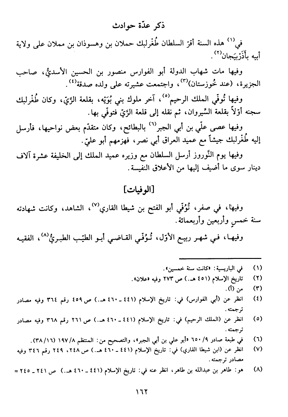 وَفِيهَا، فِي شَهْرِ رَبِيعٍ الْأَوَّلِ، تُوُفِّيَ الْقَاضِي أَبُو الطَّيِّبُ الطَّبَرِيُّ، الْفَقِيهُ
