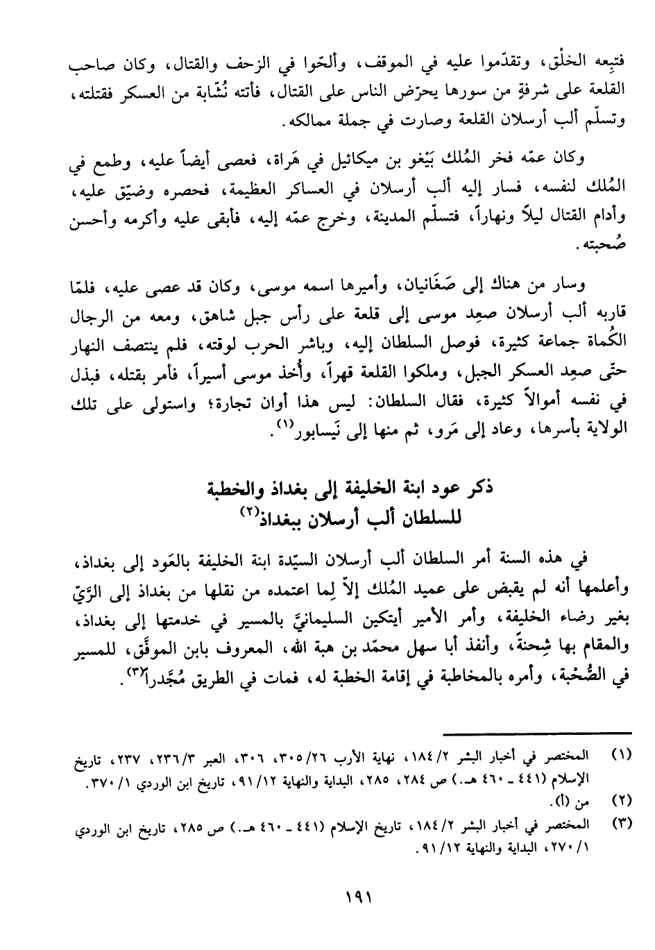 ذِكْرُ عَوْدِ ابْنَةِ الْخَلِيفَةِ إِلَى بَغْدَاذَ وَالْخِطْبَةِ لِلسُّلْطَانِ أَلْبَ أَرَسْلَانَ بِبَغْدَاذَ.