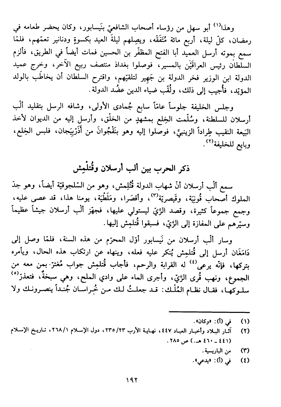 وَجَلَسَ الْخَلِيفَةُ جُلُوسًا عَامًّا سَابِعَ جُمَادَى الْأُولَى، وَشَافَّهُ الرُّسُلُ بِتَقْلِيدِ أَلْبَ أَرَسْلَانَ لِلسَّلْطَنَةِ، وَسُلِّمَتِ الْخِلَعُ بِمَشْهَدٍ مِنَ الْخَلْقِ، وَأَرْسَلَ إِلَيْهِ مِنَ الدِّيوَانِ لِأَخْذِ الْبَيْعَةِ النَّقِيبَ طِرَادًا الزَّيْنَبِيَّ، فَوَصَلُوا إِلَيْهِ وَهُوَ بِنَقْجُوَانَ مِنْ أَذْرَبِيجَانَ، فَلَبِسَ الْخِلَعَ، وَبَايَعَ الْخَلِيفَةَ.